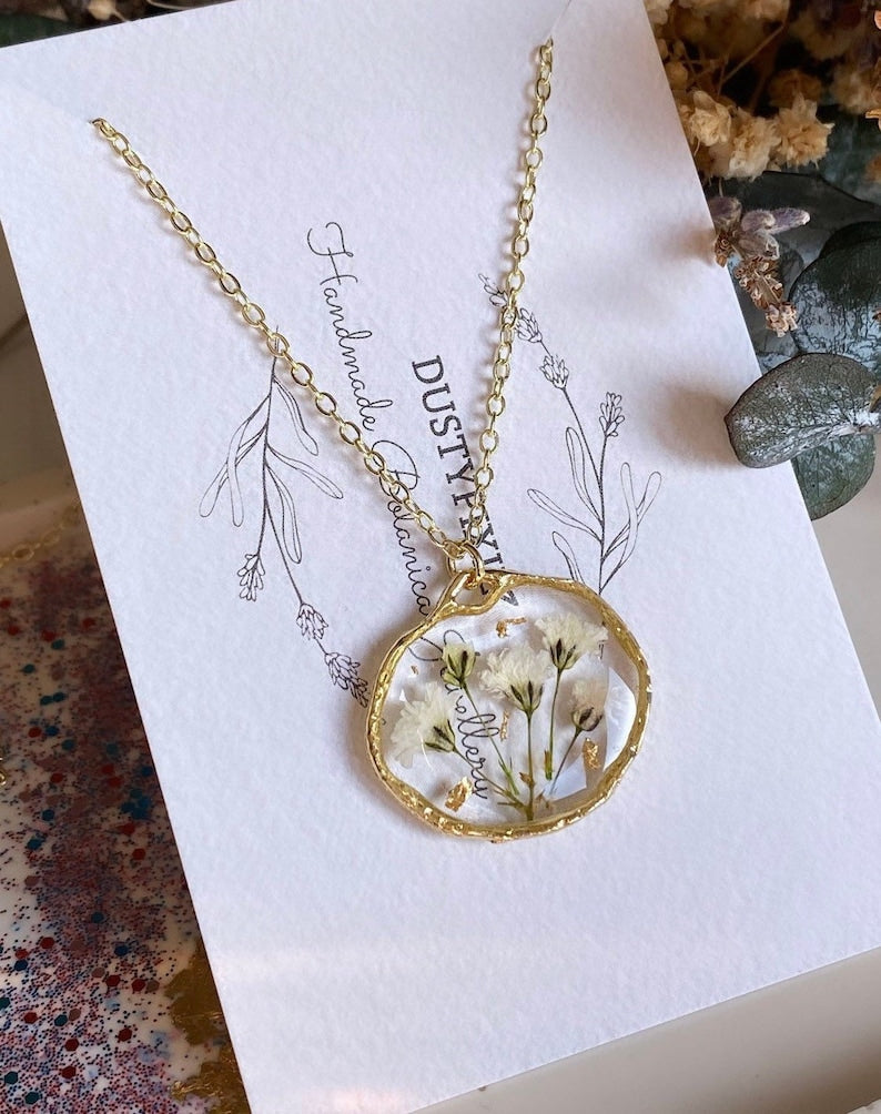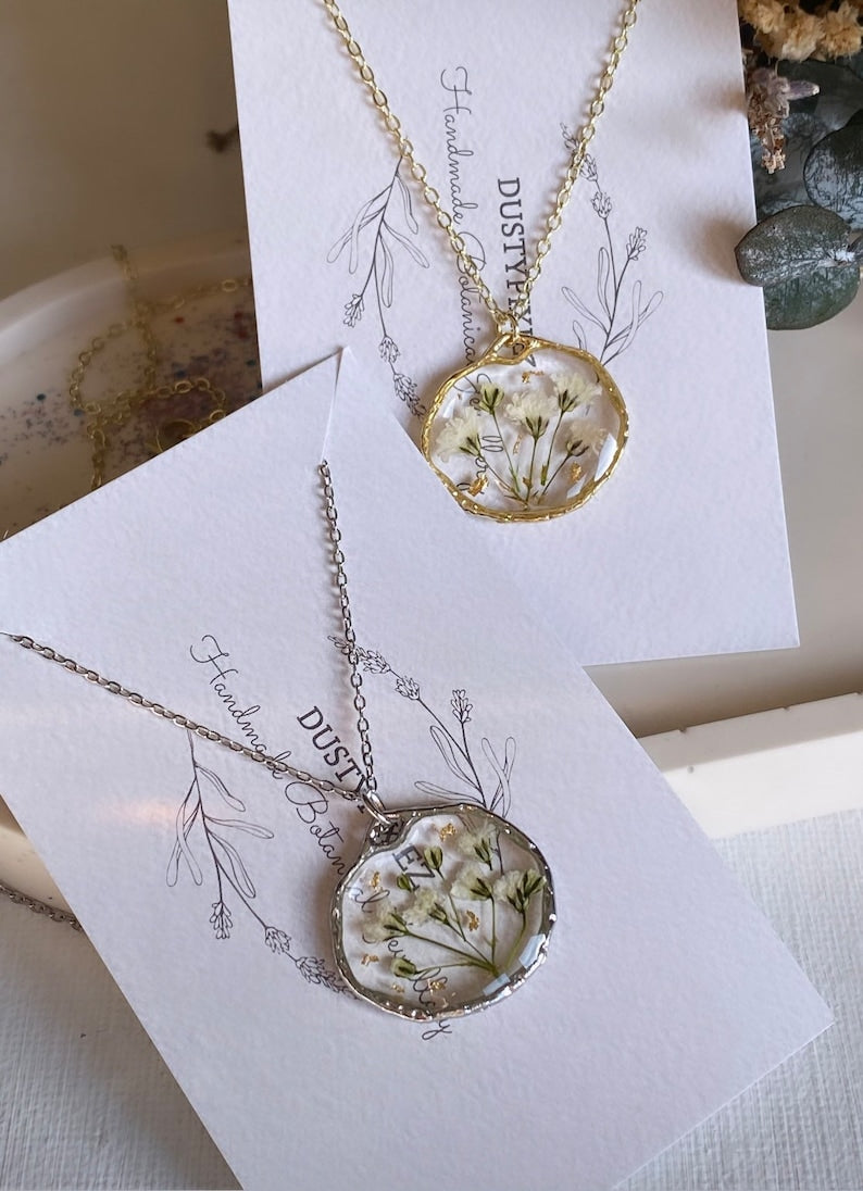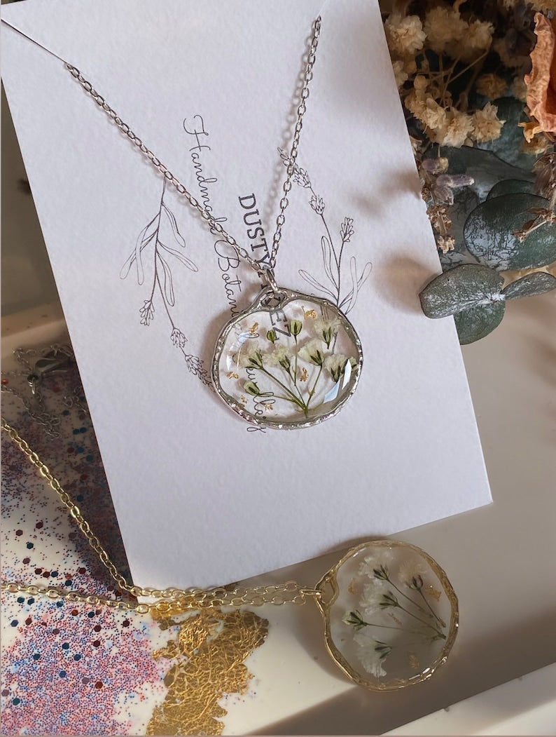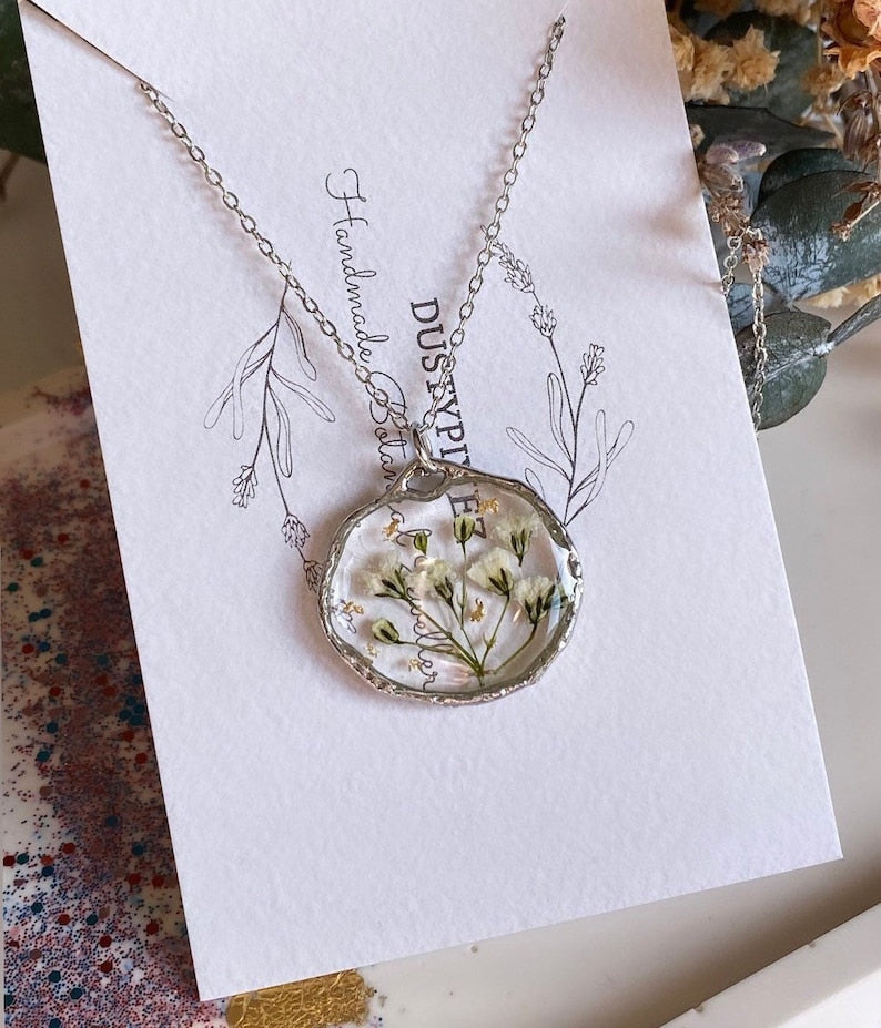 Baby’s breath Gypsophila flower necklace, pressed flower resin jewellery, silver, 14k gold plated, gifts for her