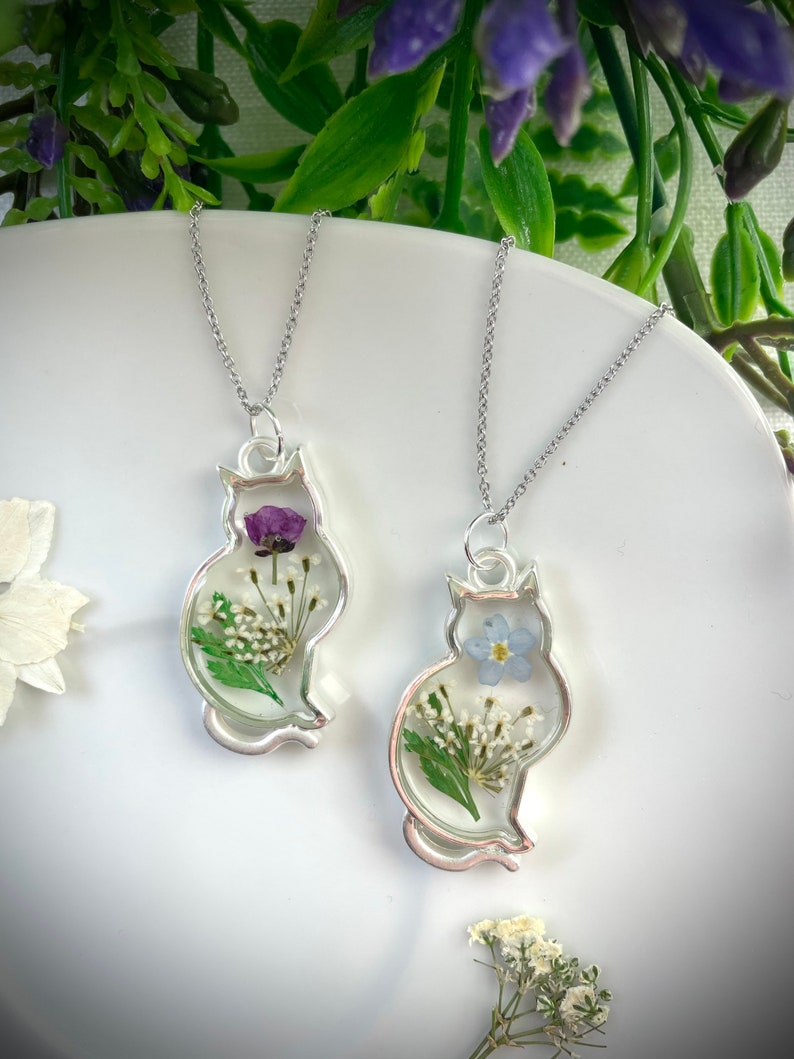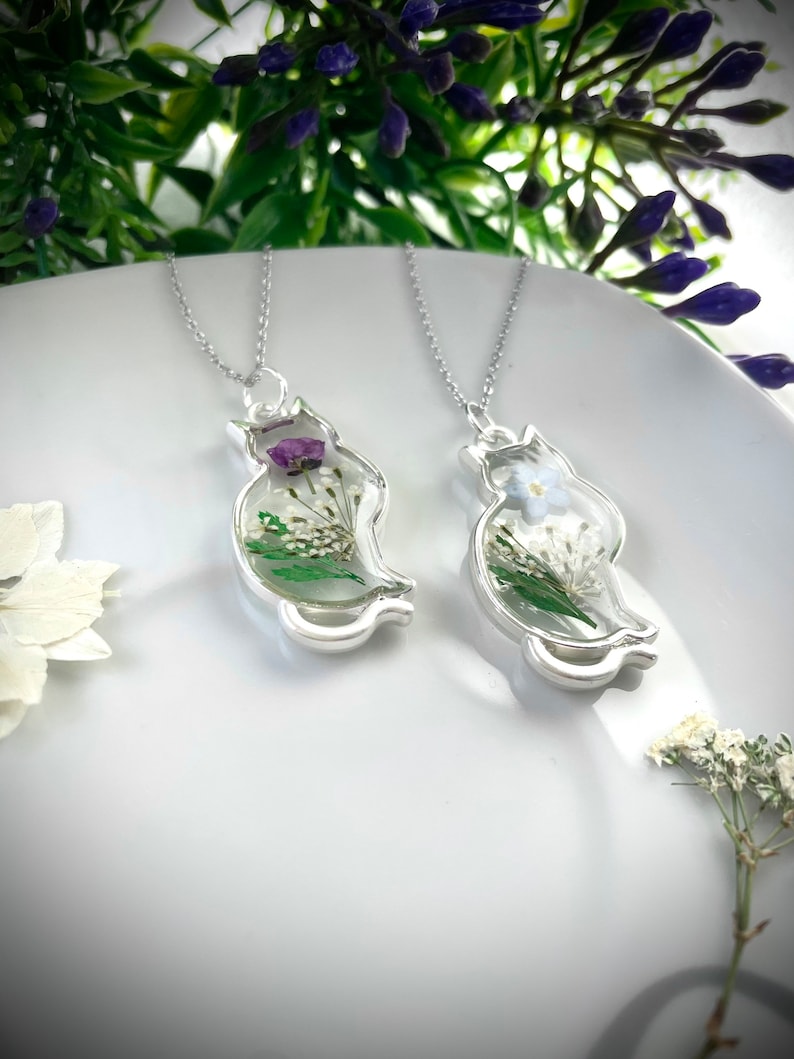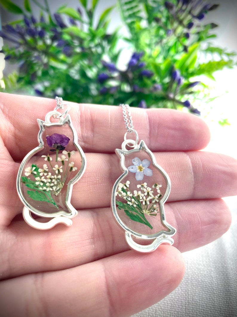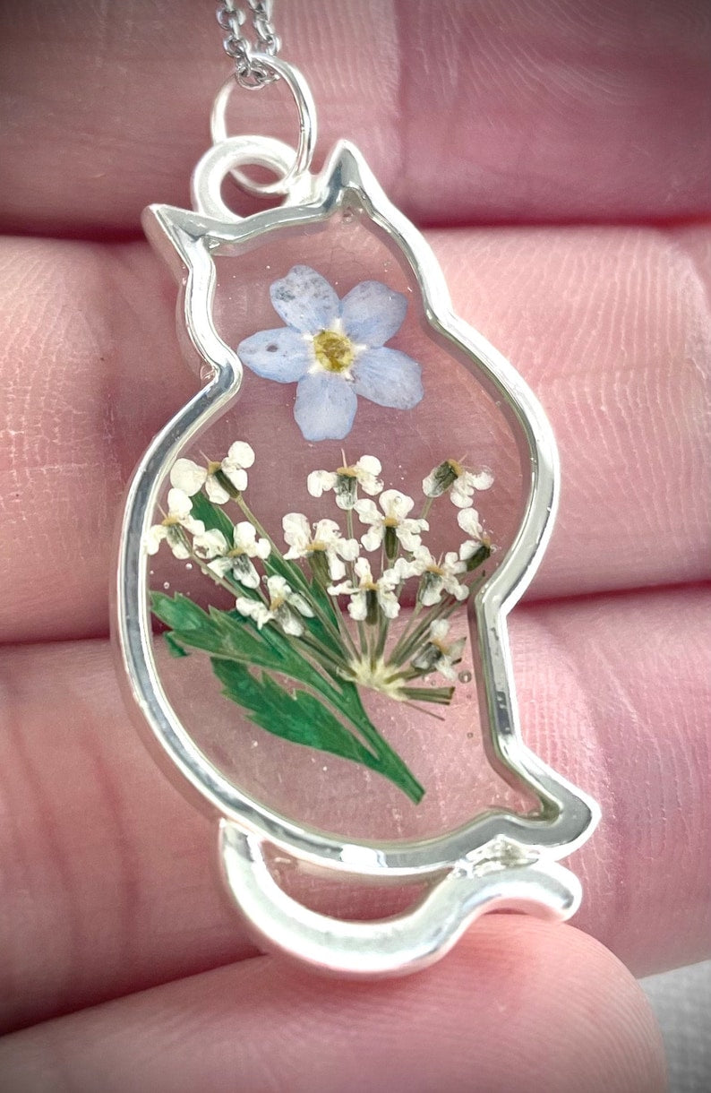 Cat pendant in resin and real flowers. Forget-me-not flowers, queen's lace and Ulysses' violet. Cat necklace with flowers