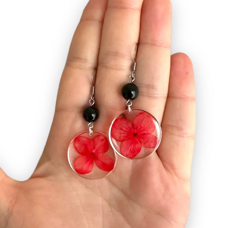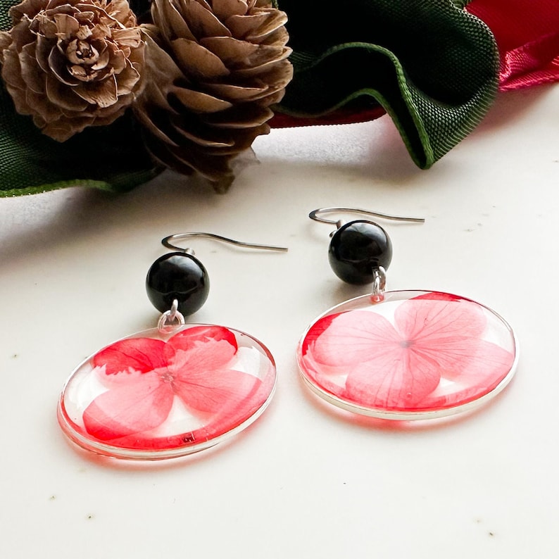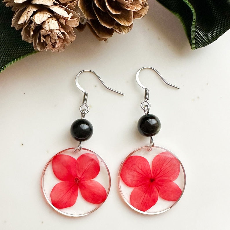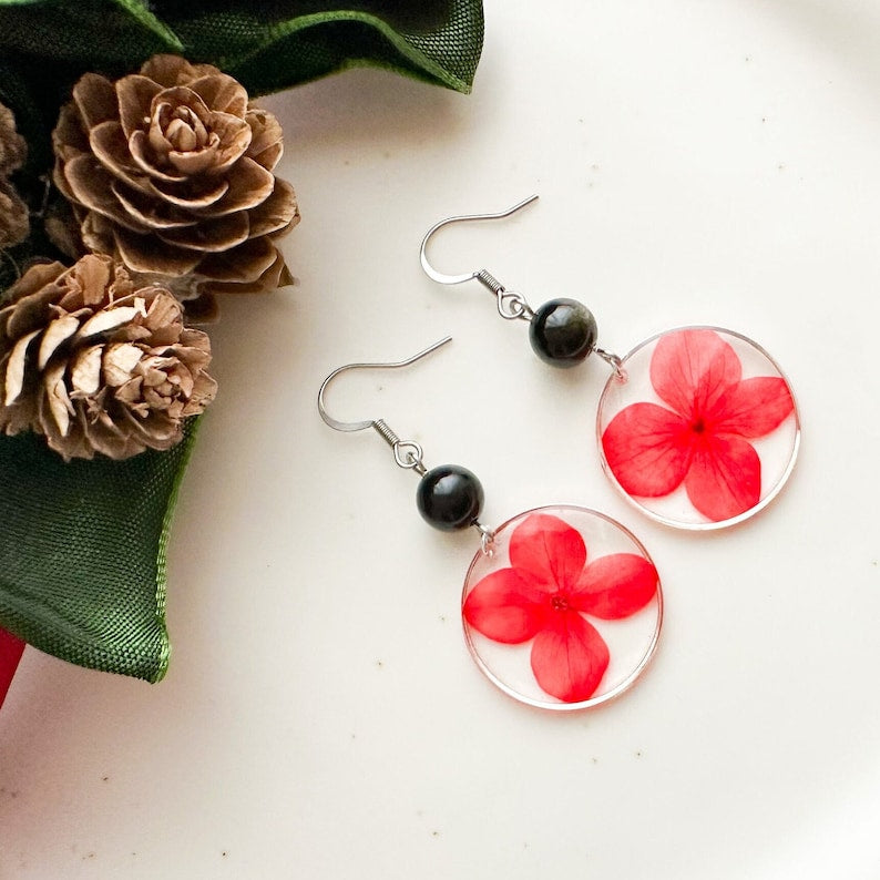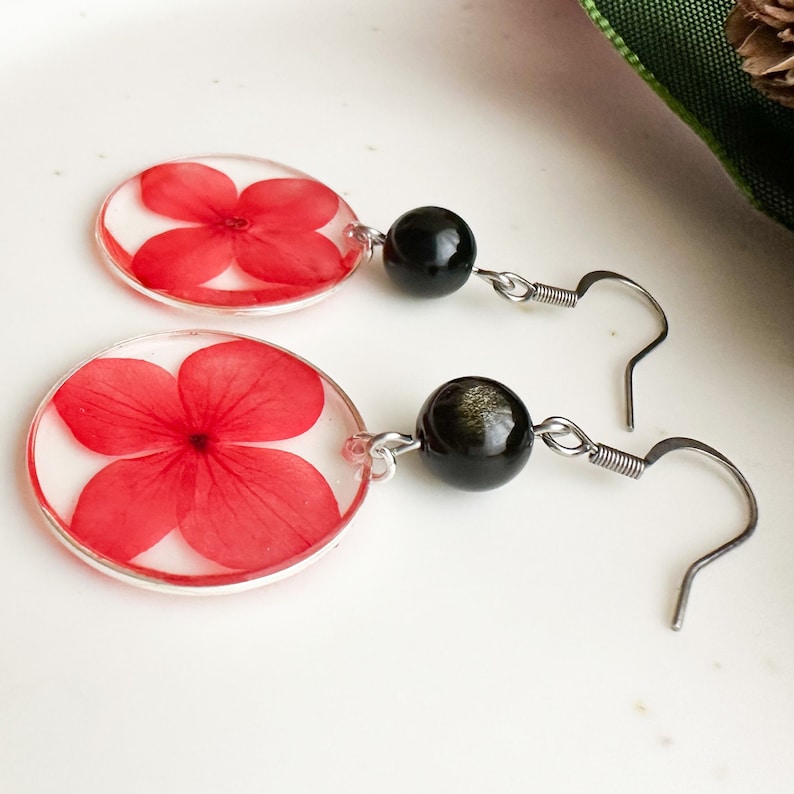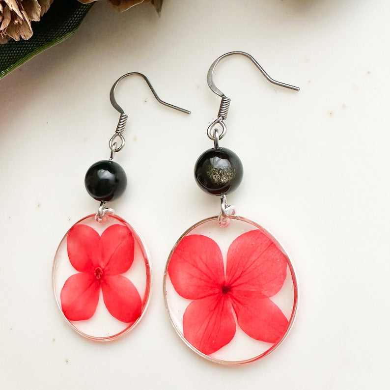 Colored resin earrings, Red flower earrings, Black stone earrings, Obsidian earrings, Stainless steel earrings, Gift idea Woman