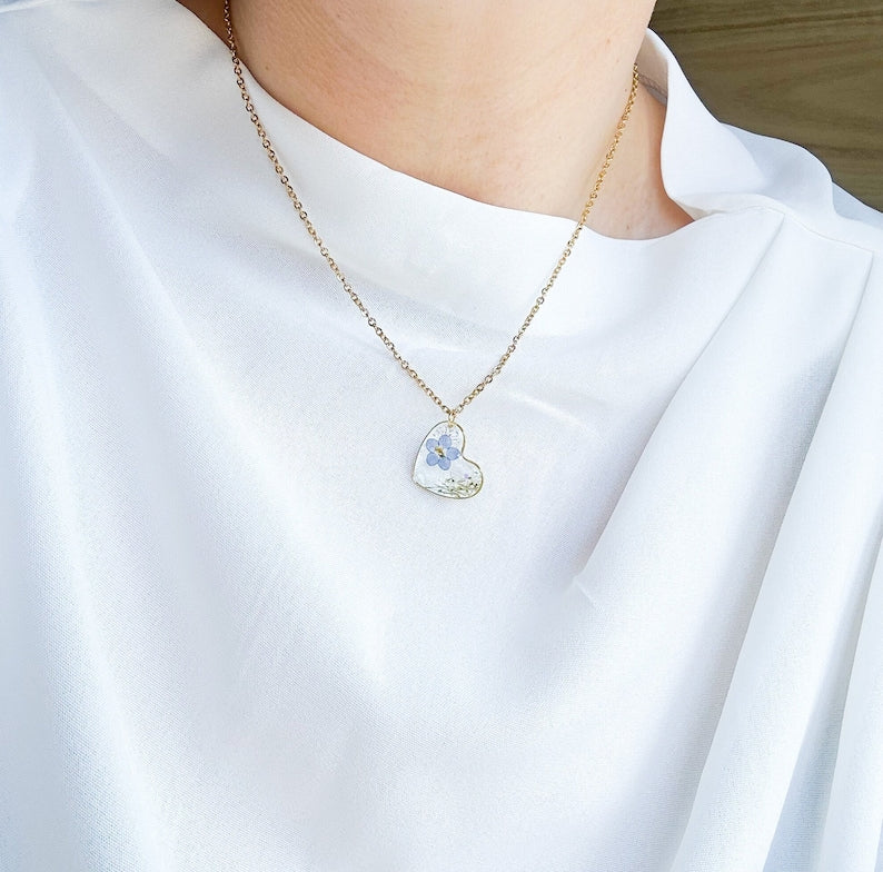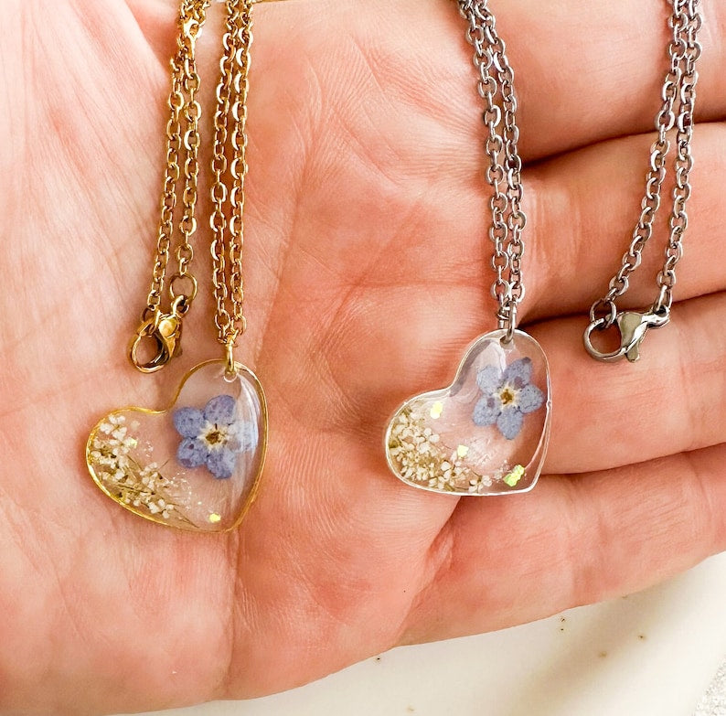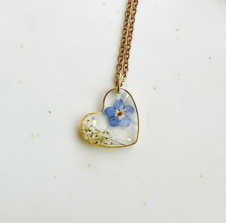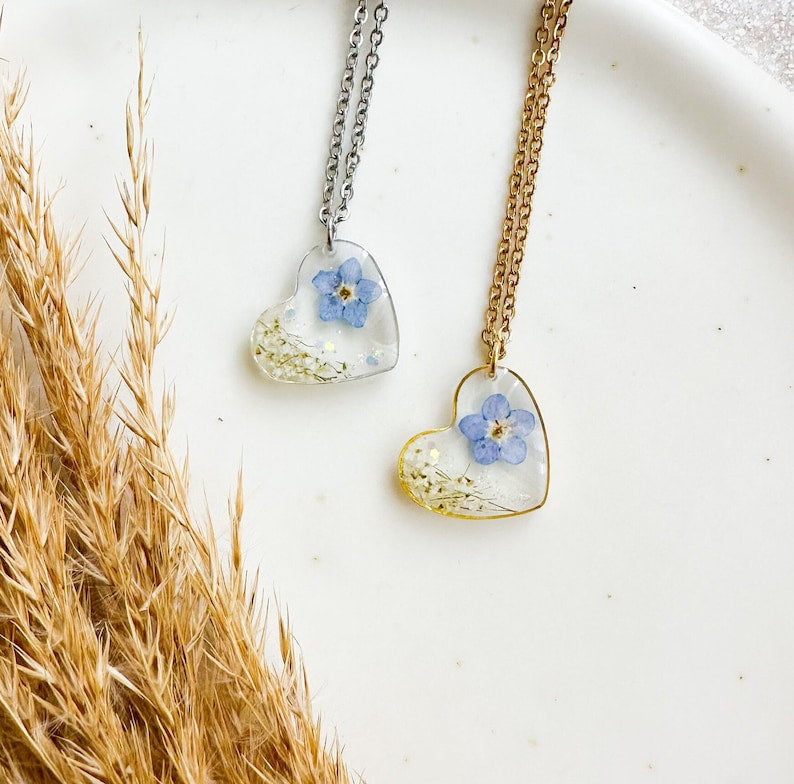 Dainty heart resin necklace with real pressed flowers, Forget Me Not and Queen Anne lace jewelry, Plant lady gift, Miscarriage necklace