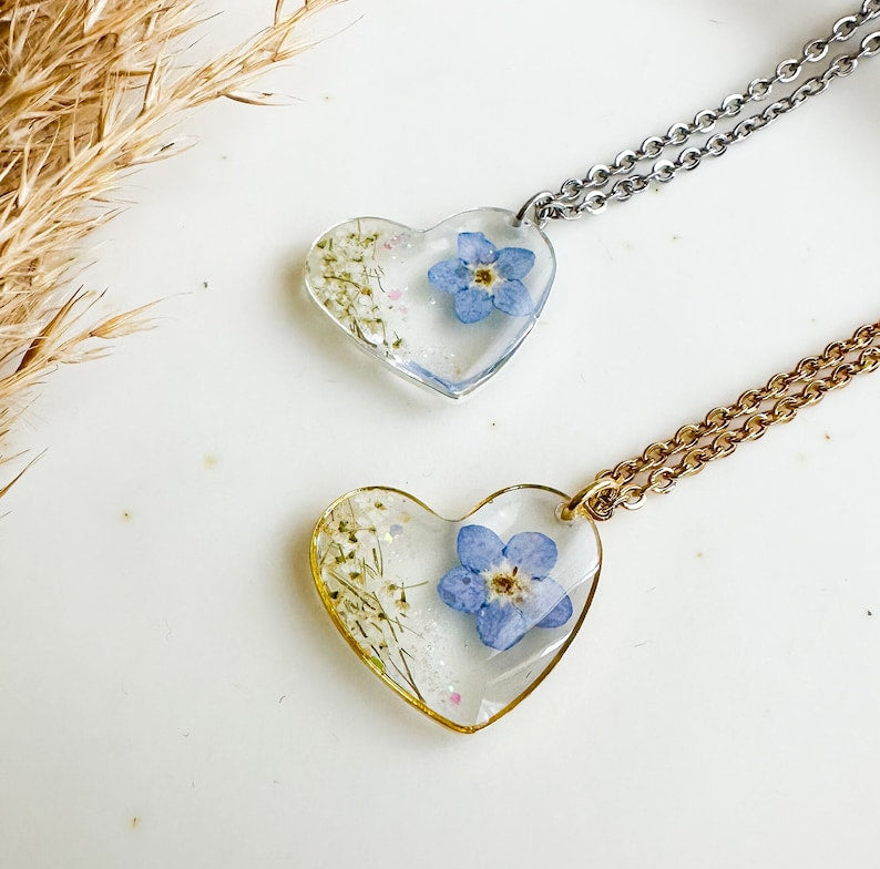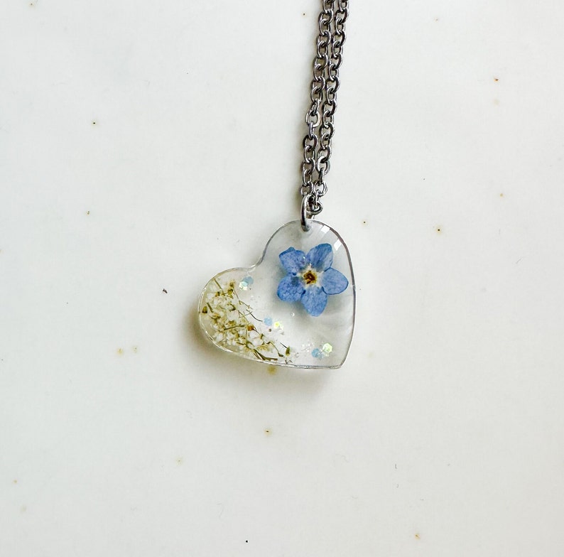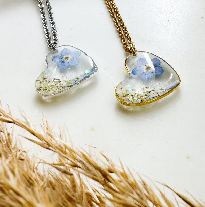 Dainty heart resin necklace with real pressed flowers, Forget Me Not and Queen Anne lace jewelry, Plant lady gift, Miscarriage necklace