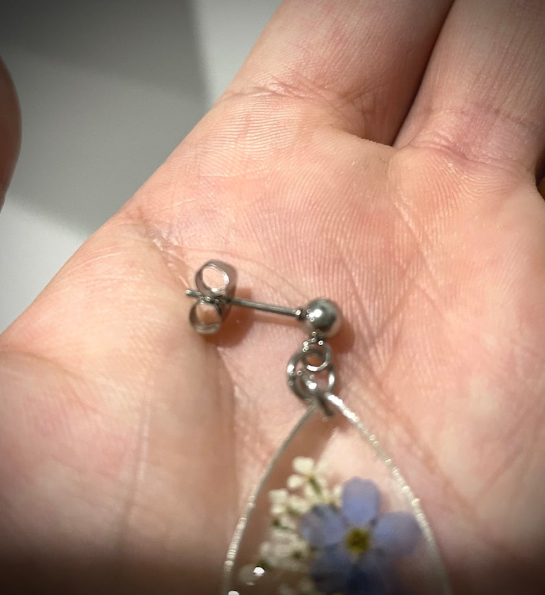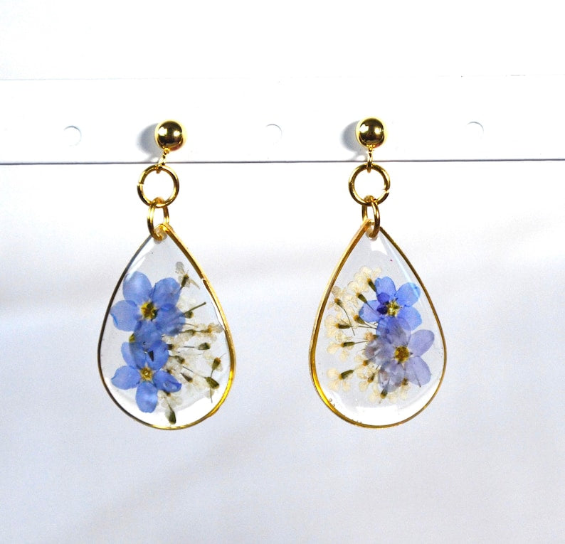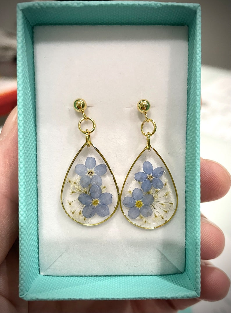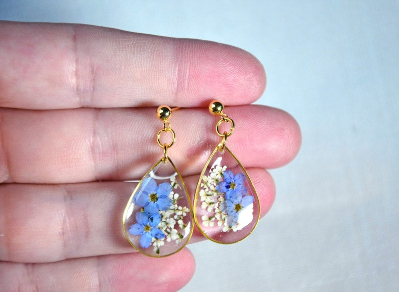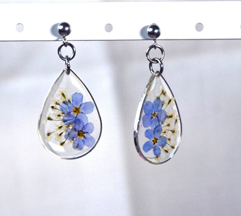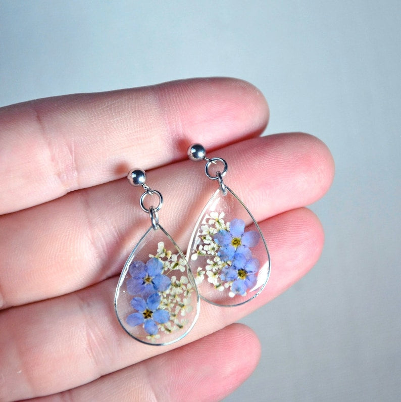 Drop resin earrings with forget-me-not flowers. Forget-me-not earrings and white lace. Real flowers do not forget me.