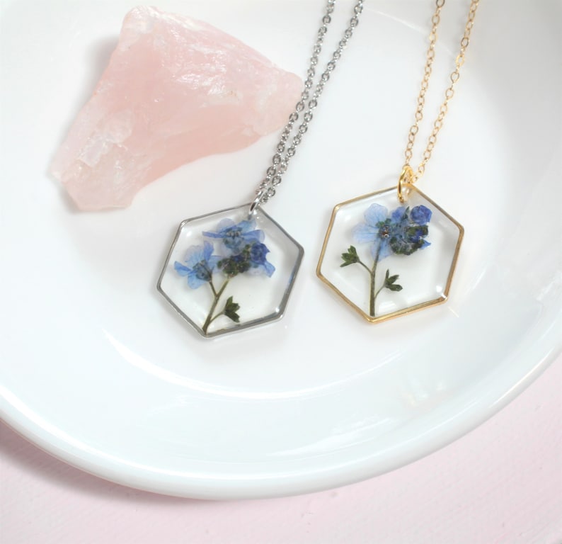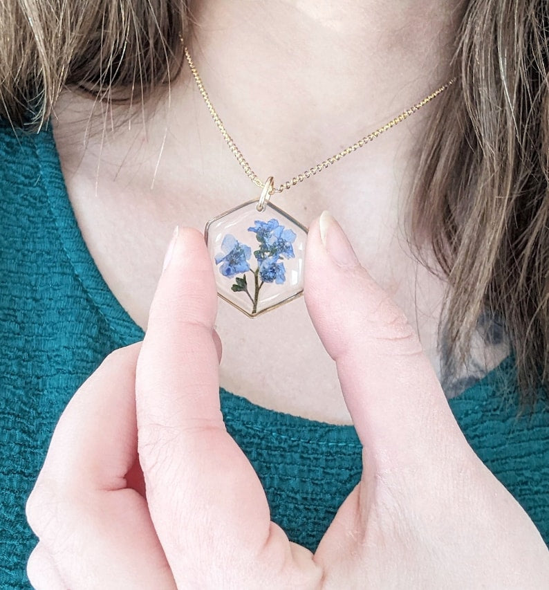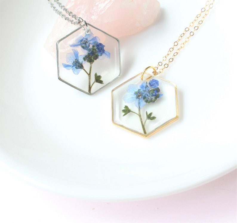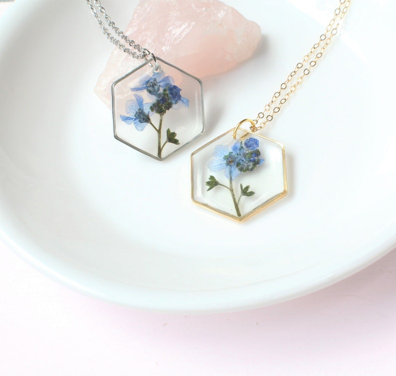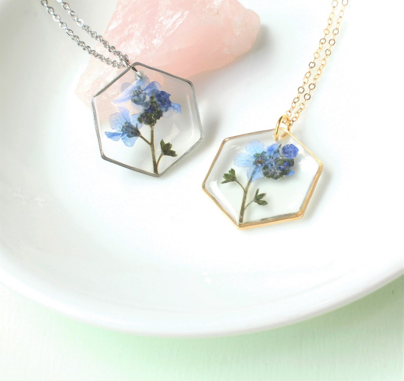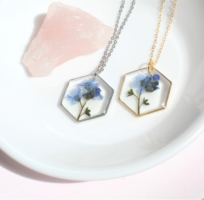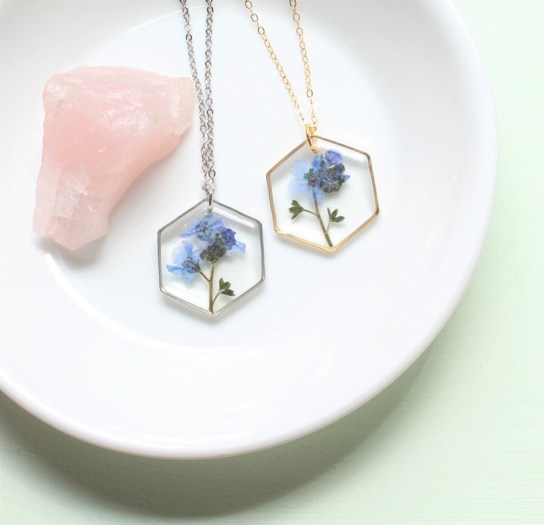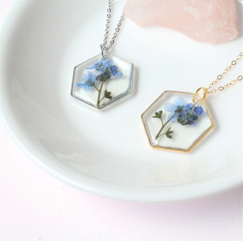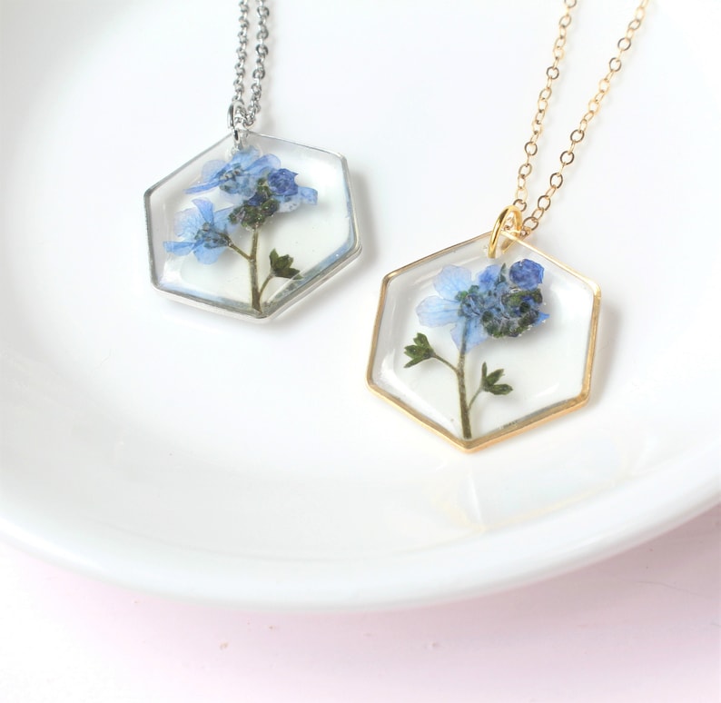 Forget-Me-Not Necklace, Pressed Flower Necklace, Hexagon Forget Me Not Pendant, Resin Plant, Handmade Botanical Mother's Day Gift for Her