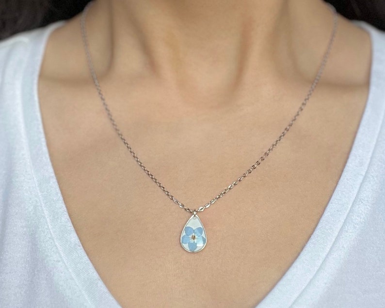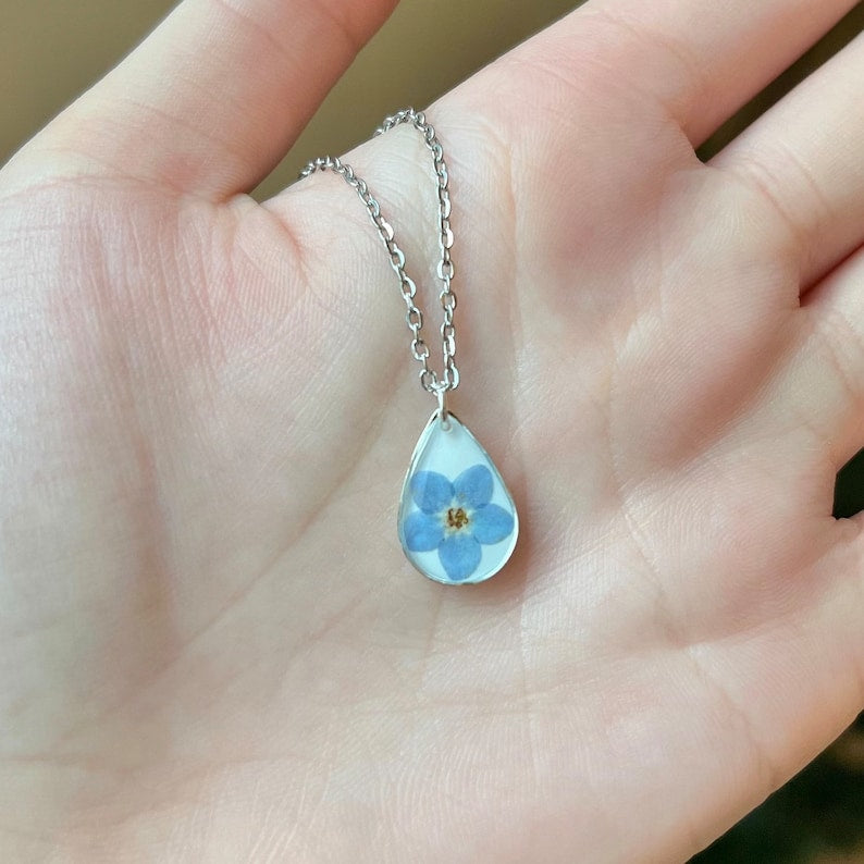 Forget Me Not Necklace, Real Pressed Flower, Minimalist Resin Jewelry, Teardrop Pendant, 18 Inch Stainless Steel Chain