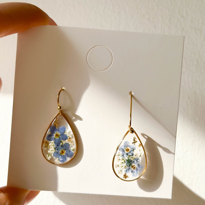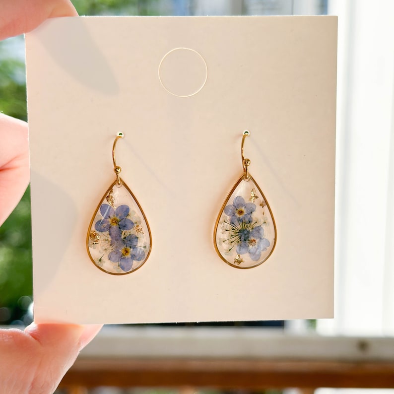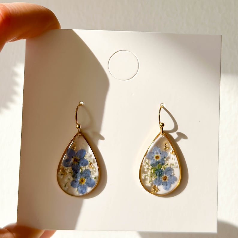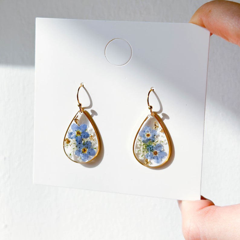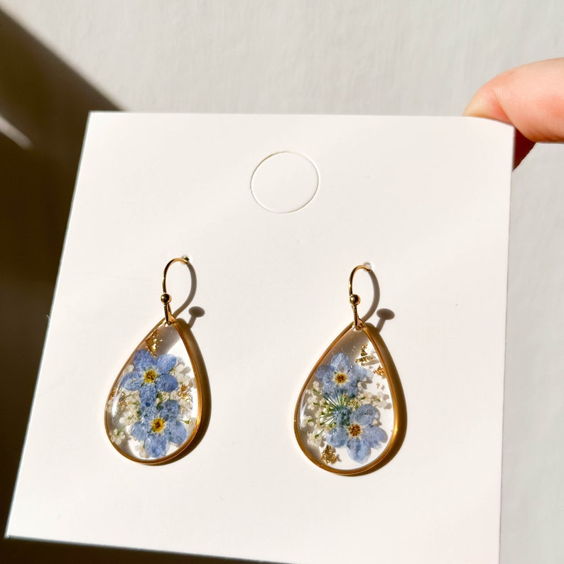 Gold Forget Me Not Flower Earrings, Handmade Pressed Real Flower Resin Earrings, Dangle Drop Earrings, Dired Flower Earrings, Birthday Gift
