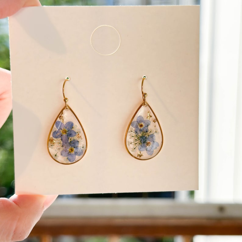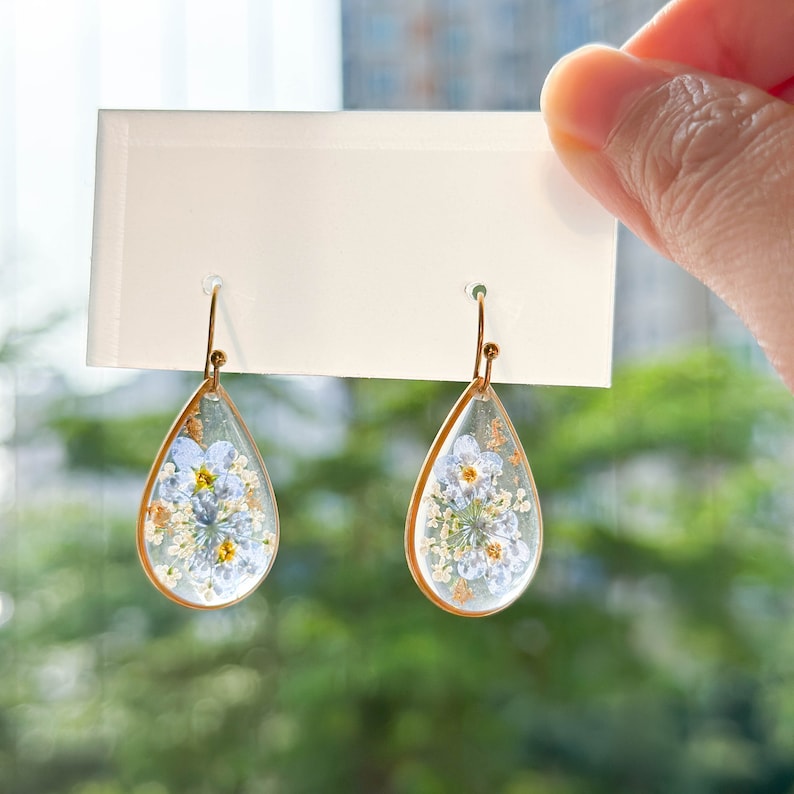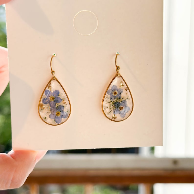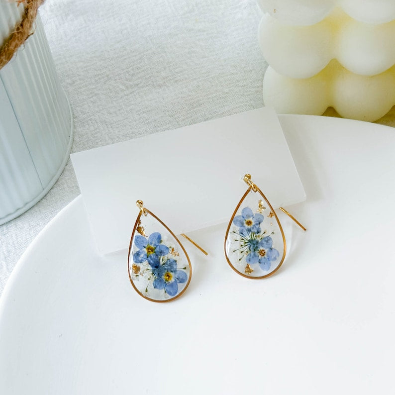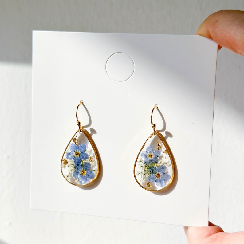 Gold Forget Me Not Flower Earrings, Handmade Pressed Real Flower Resin Earrings, Dangle Drop Earrings, Dired Flower Earrings, Birthday Gift