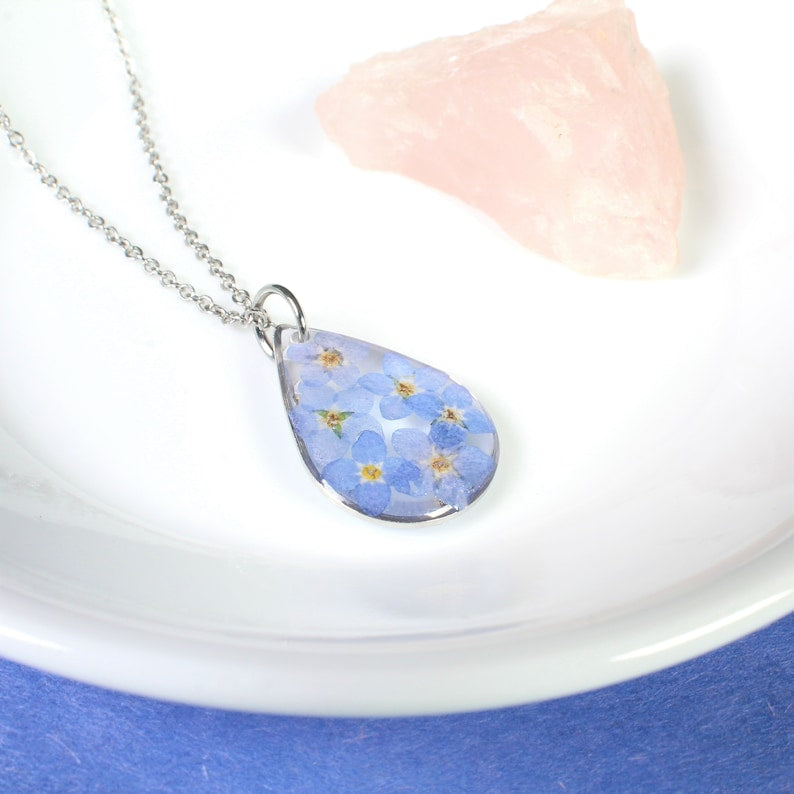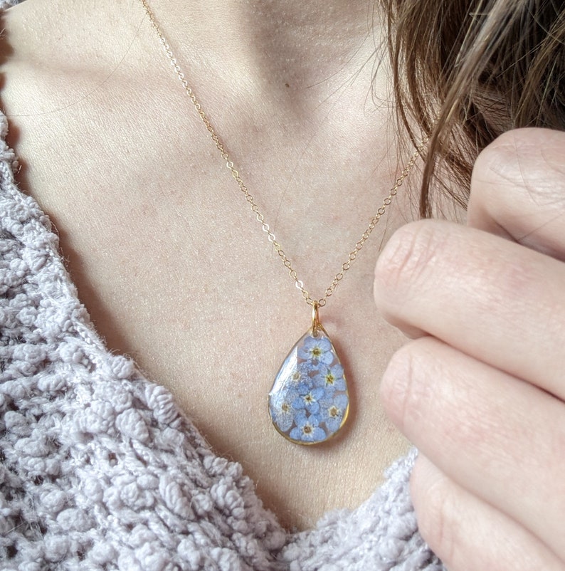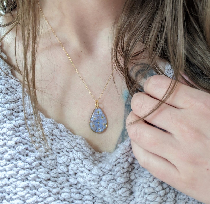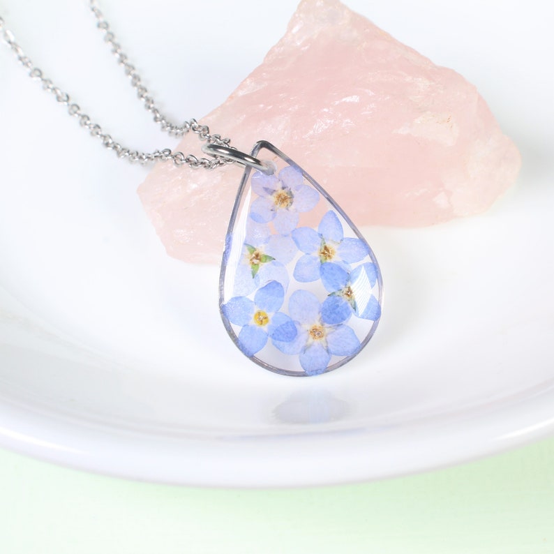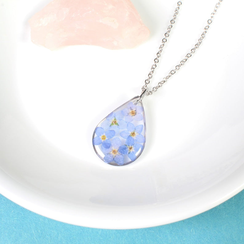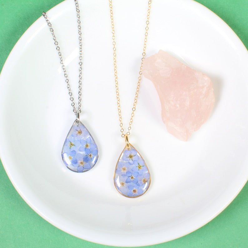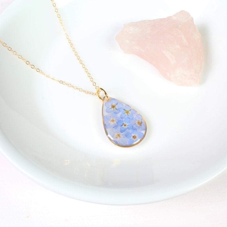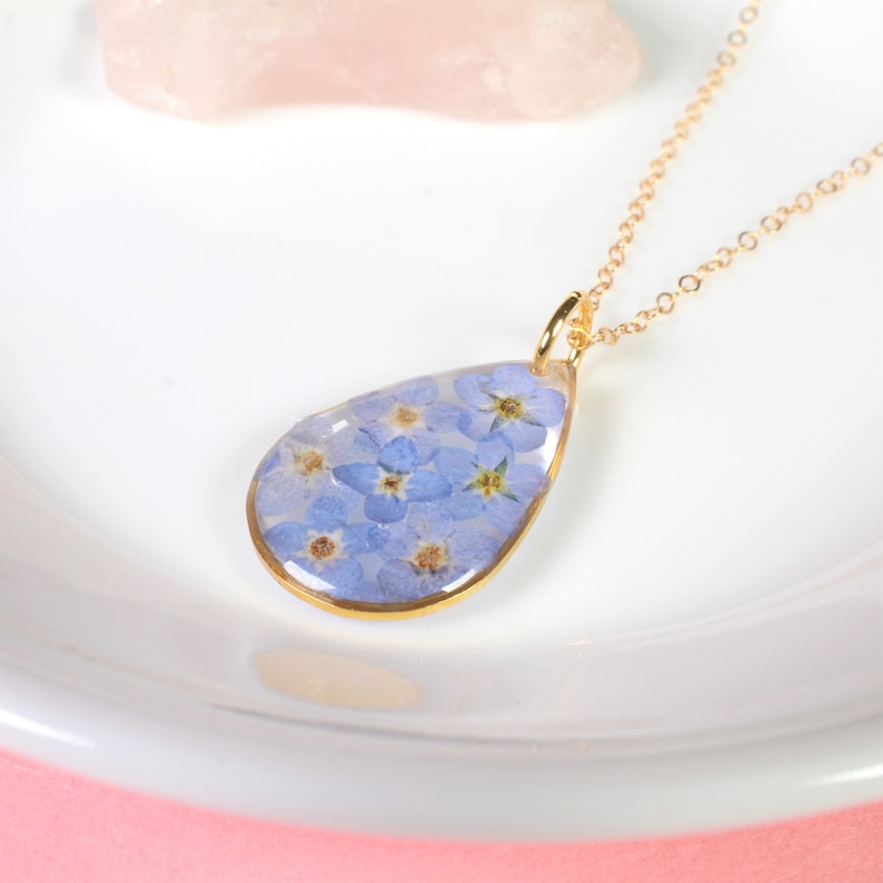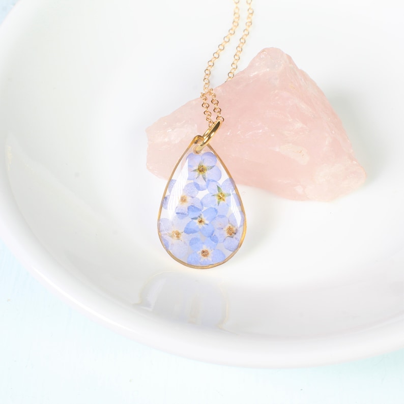 Gold forget-me-not necklace, real pressed flower teardrop pendant, handmade resin jewelry, blue forget me nots, dried botanical necklace
