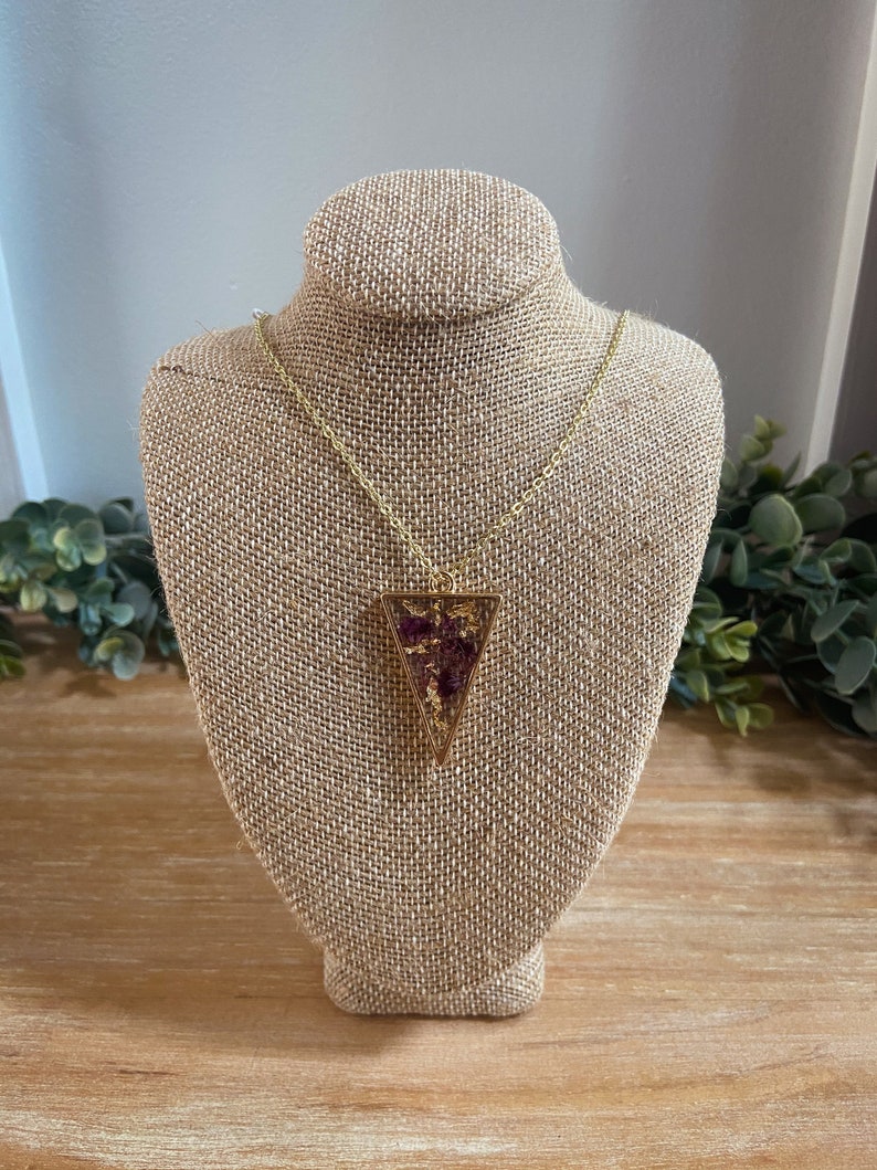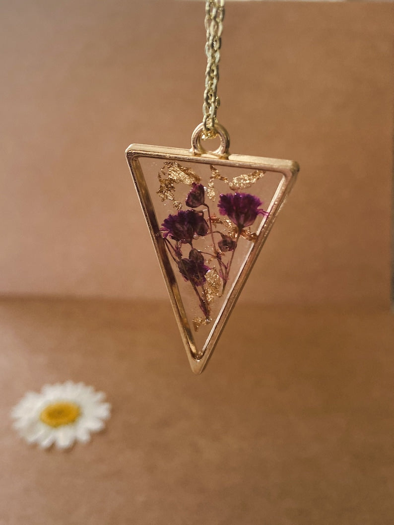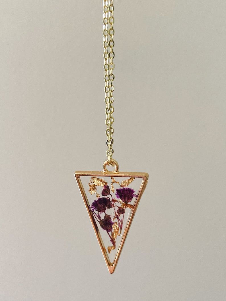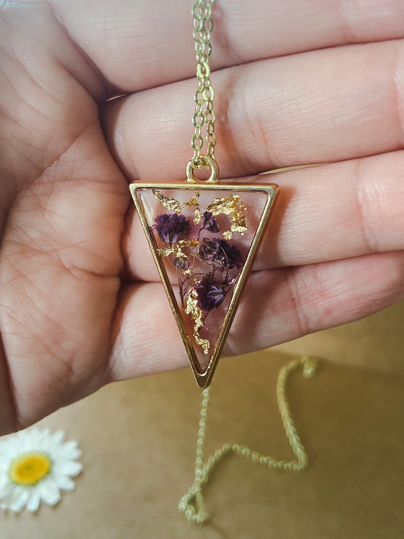 Gold Speckled Purple Baby's Breath Necklace | Resin Pendant Jewelry | Gold Flakes | Triangle Necklace | Real Wildflower Necklace