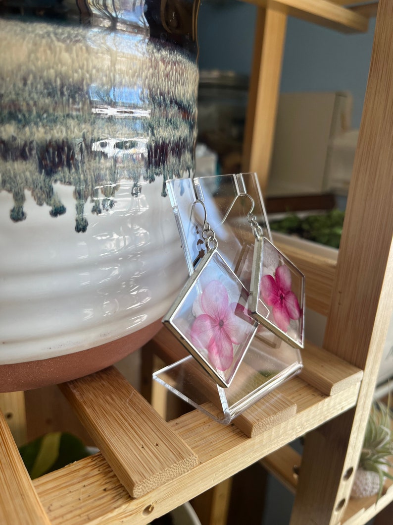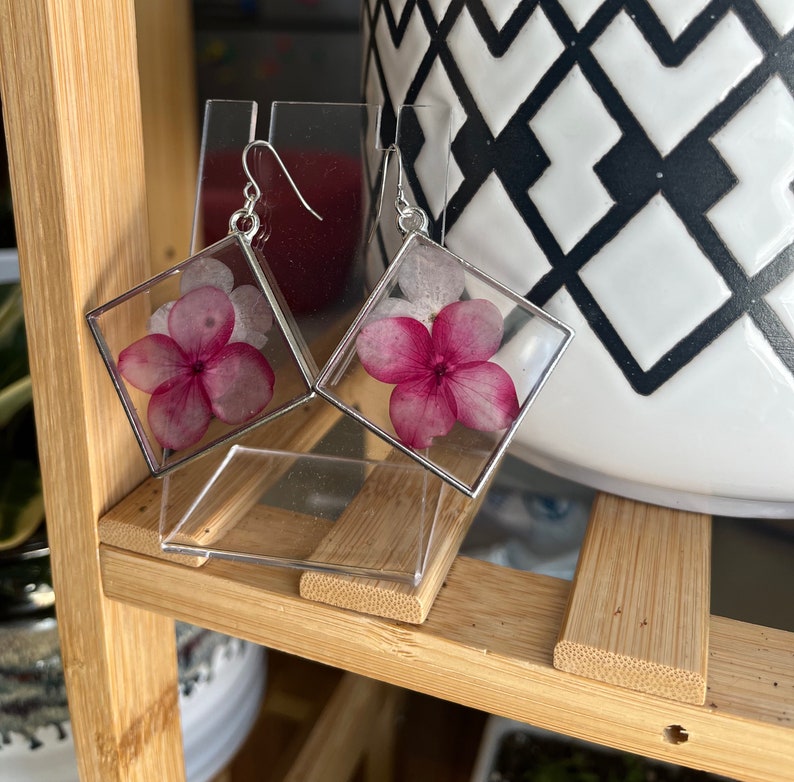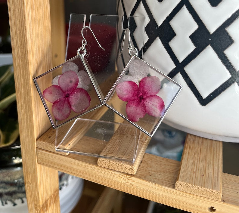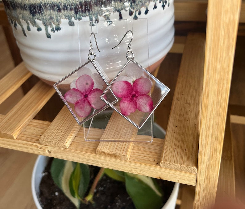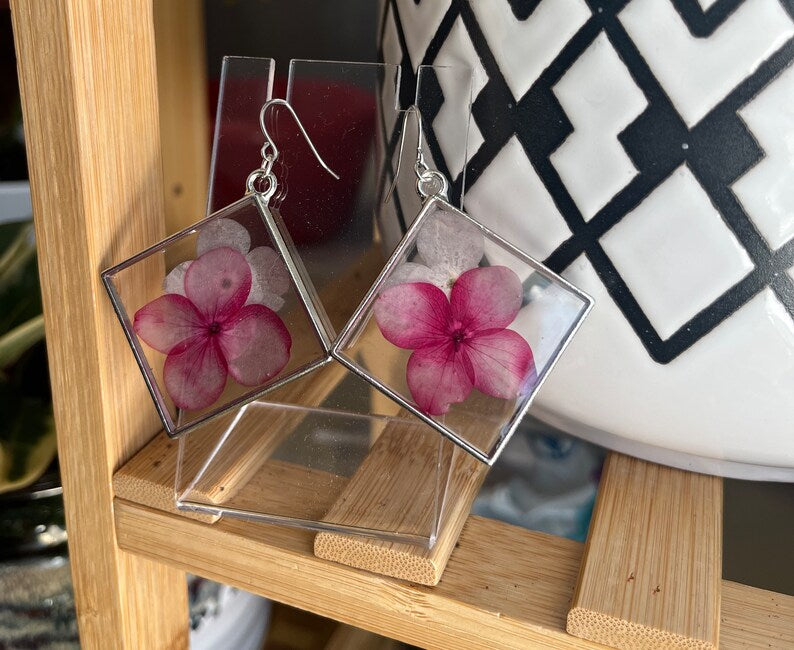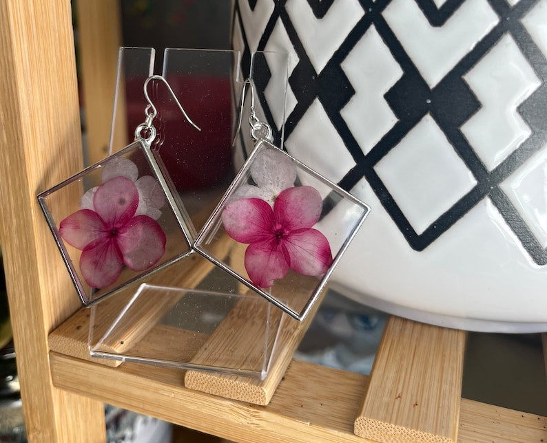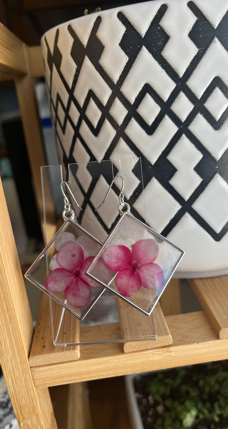 Handmade Dry Pressed Flower Resin Earrings, Gold Dangle Jewelry, Flower Earrings, Resin, Real dry pressed hydrangea flower earring