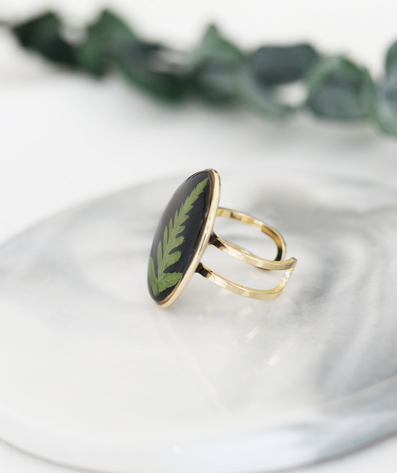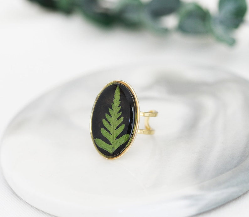 Handmade Fern Ring Green Leaf Oval Adjustable Ring Botanical Jewelry