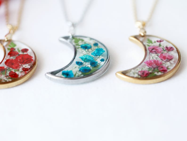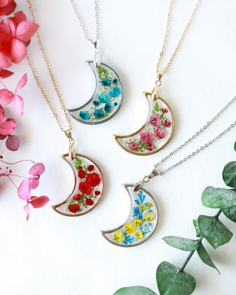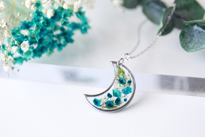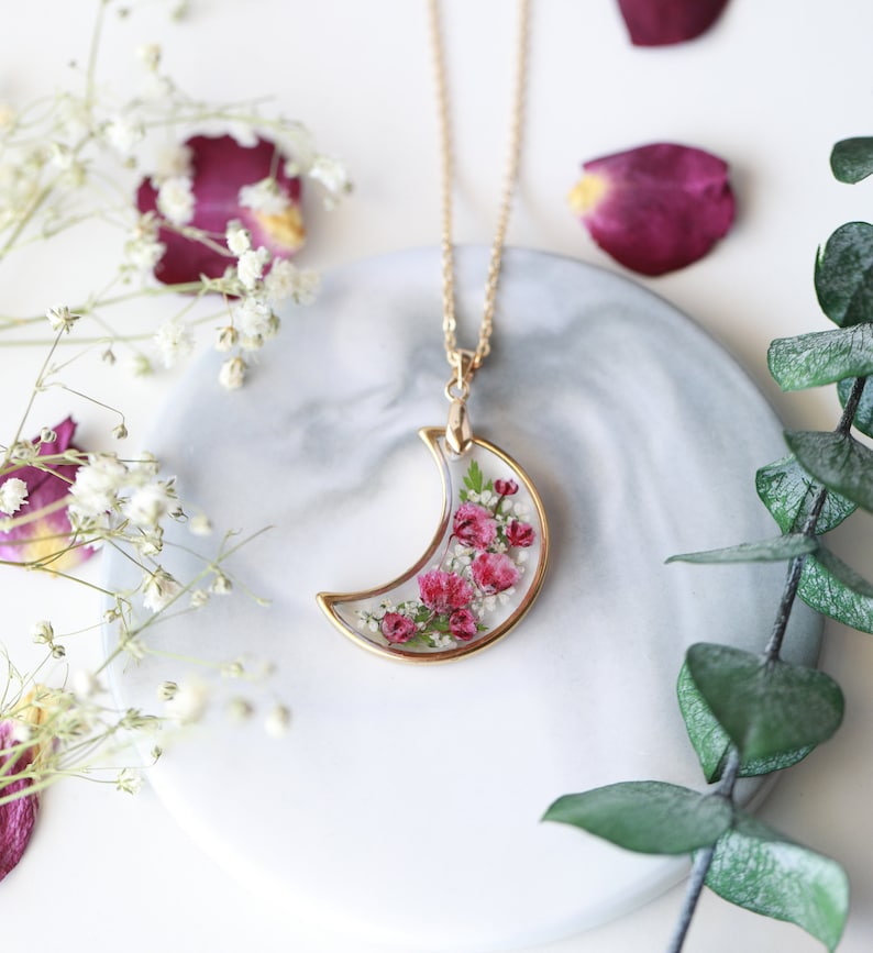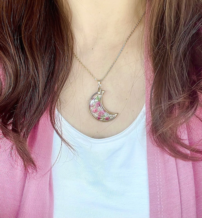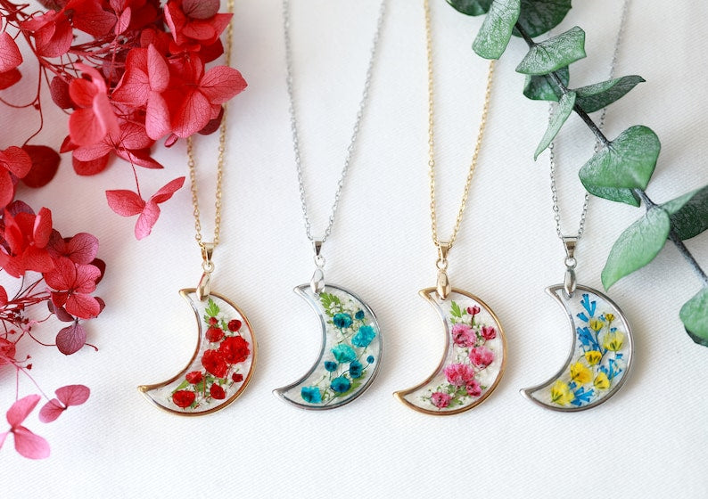 Handmade Pressed Flower Real Flower Floral Baby's Breath Crescent Moon Resin Necklace Mother's Day Gift for women girls