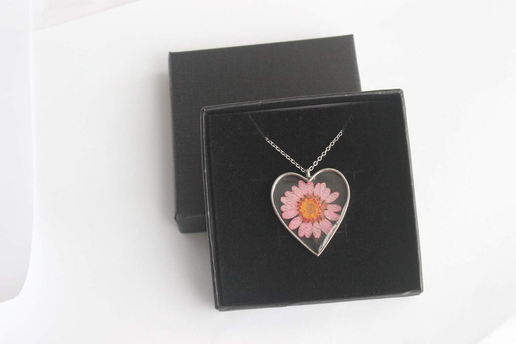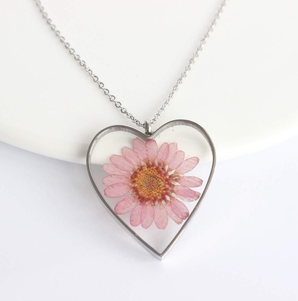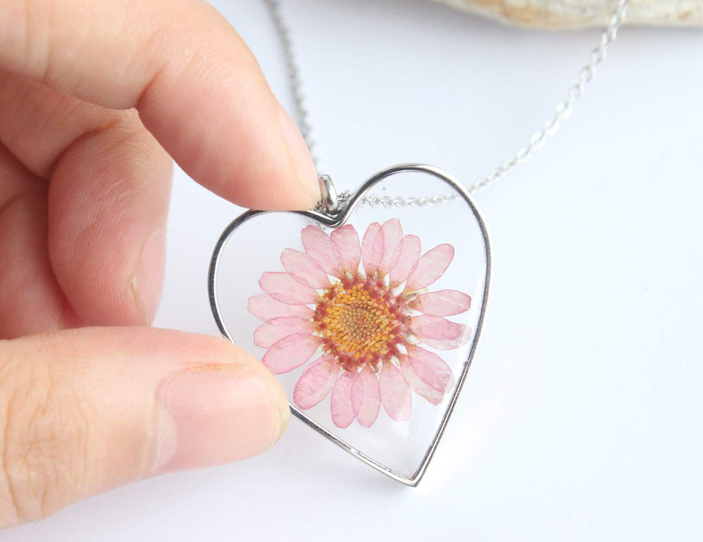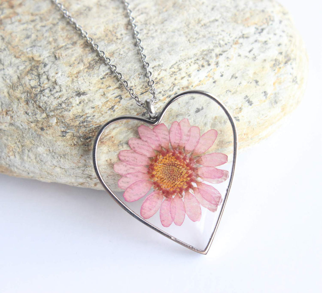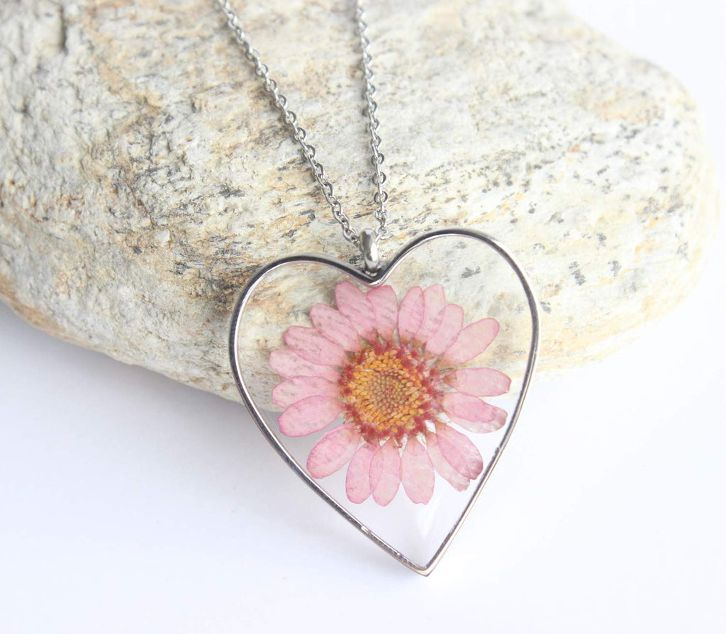 Heart Pressed Flower Pendant Necklace, Real Dried Flower Resin Jewellery