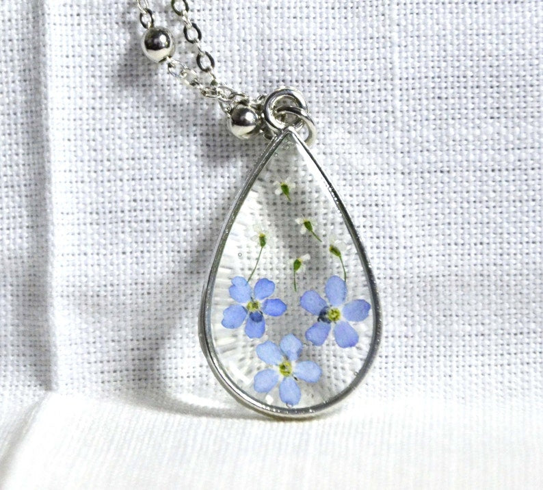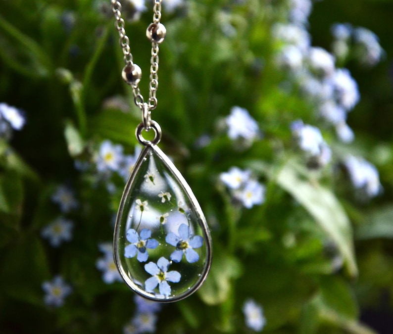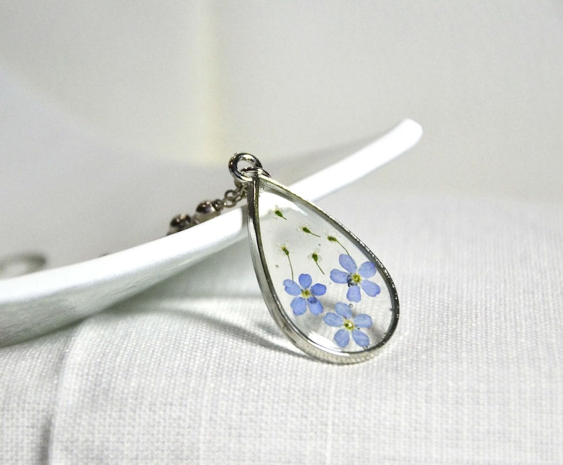Necklace with forget-me-not flowers, resin jewel with myosotis flowers