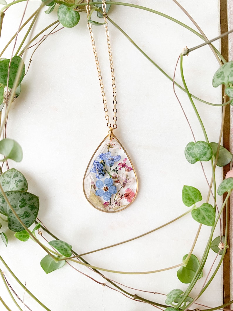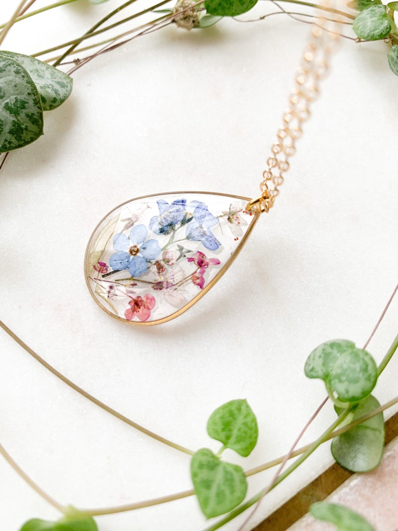Preserved forget-me-not pendant necklace on 22k gold plated chain / boho chic / pressed flowers / jewellery / floral