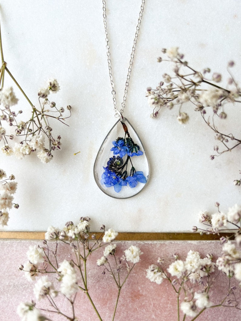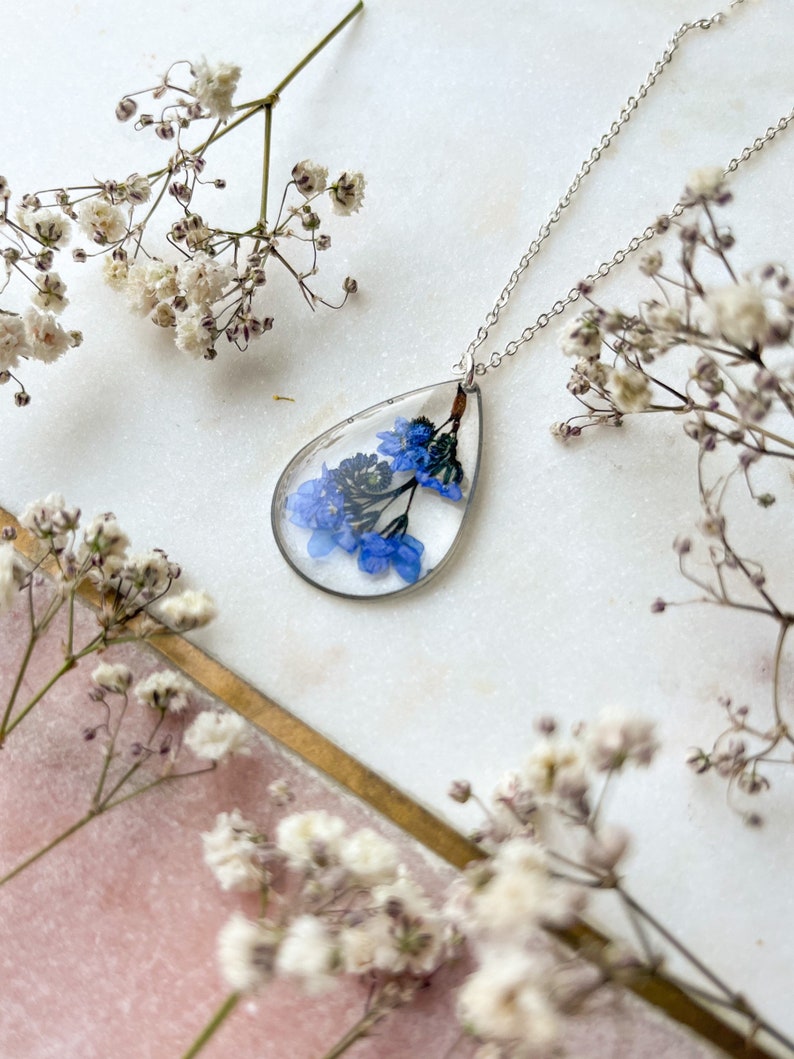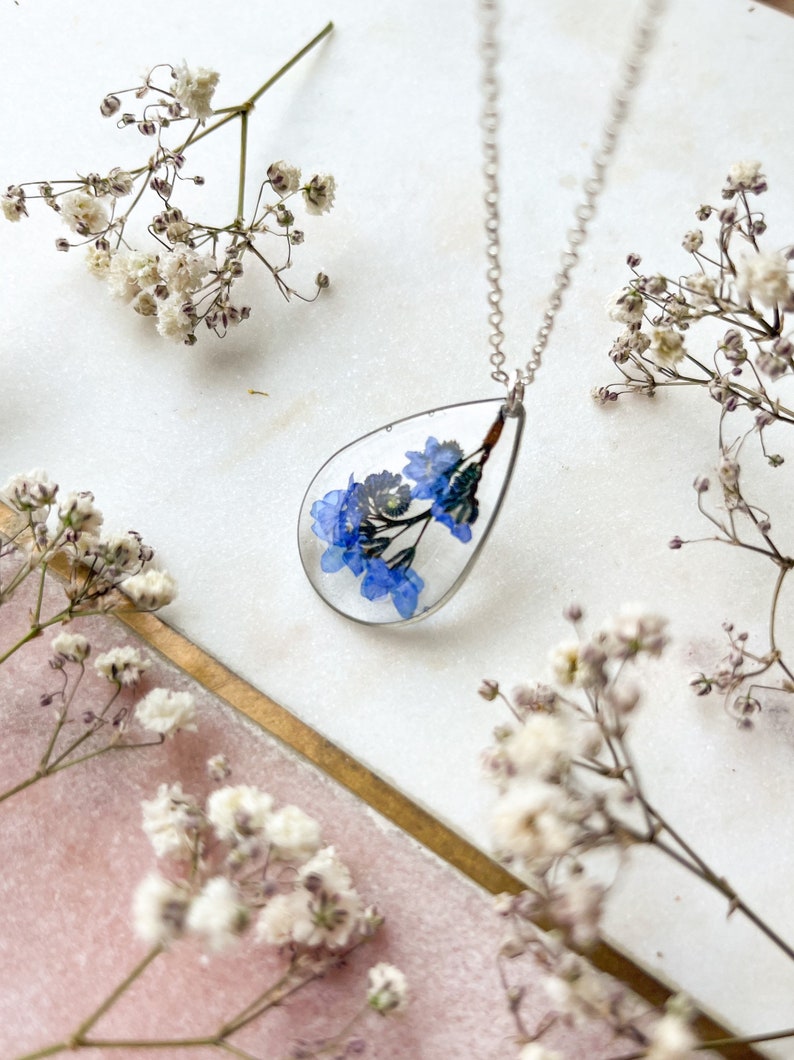 Pressed forget-me-not necklace within a silver frame on a fine silver plated fine chain / boho chic / pressed flowers / jewellery / floral