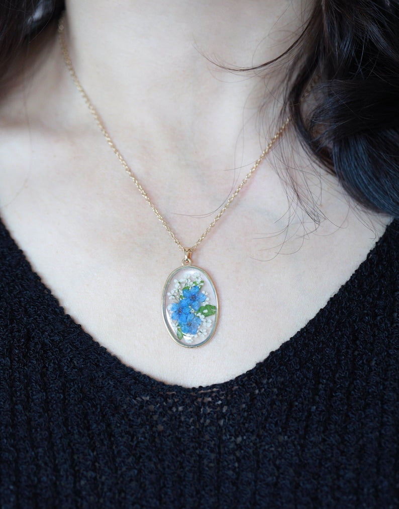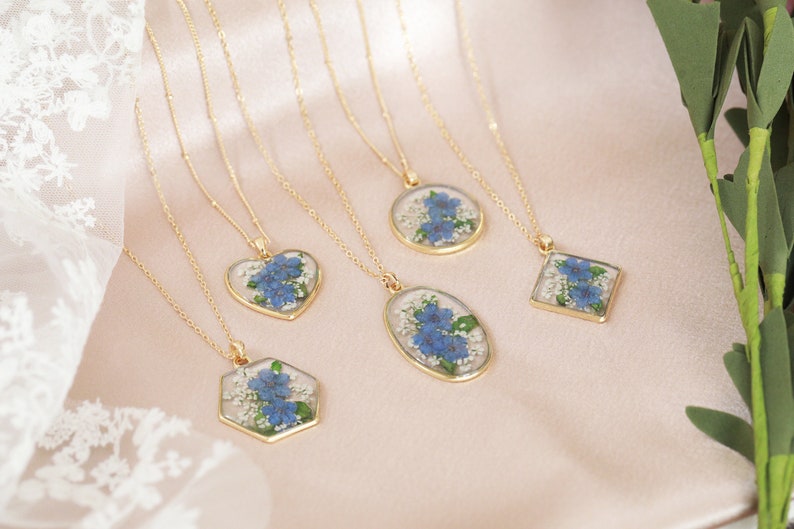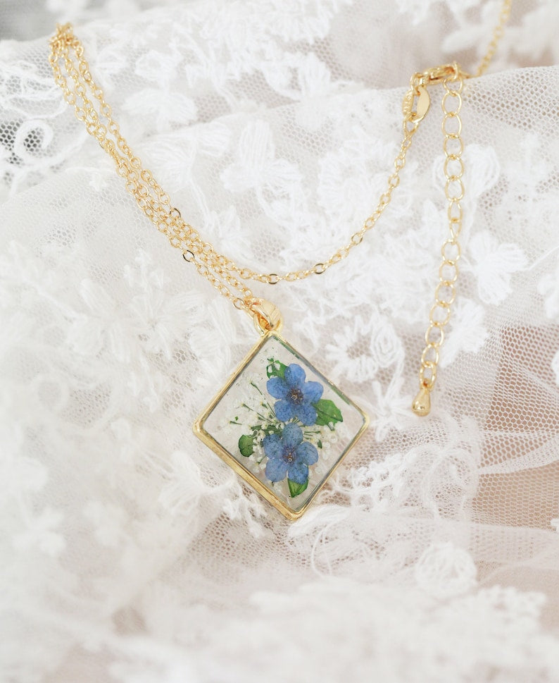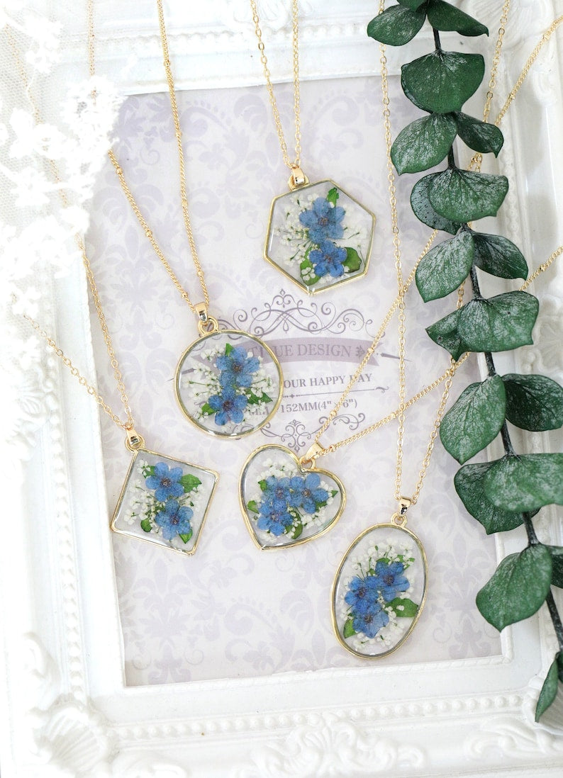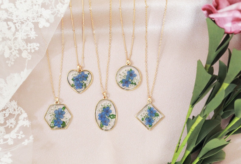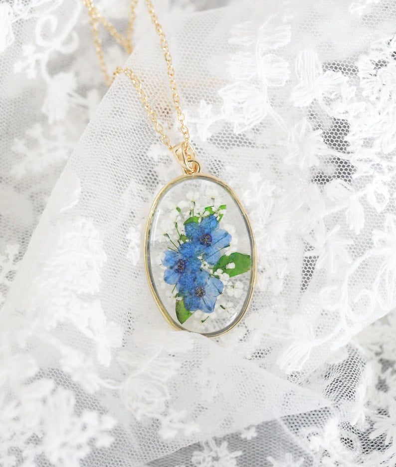 Pressed Forget Me Not Pendant Necklace| Real Flower Gold Tone Resin Necklace| Handmade Jewelry| Mother's Day Gift for her
