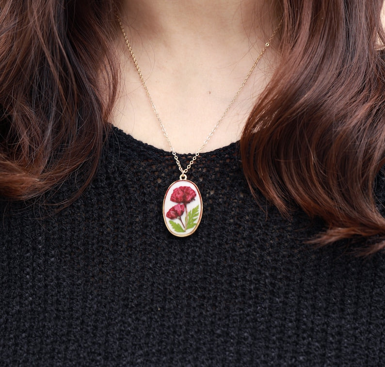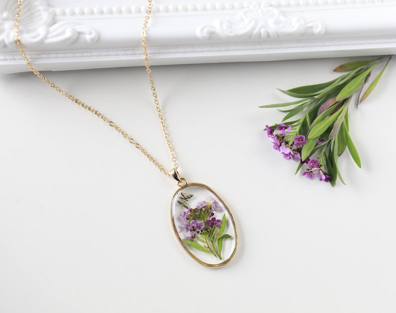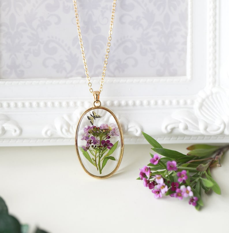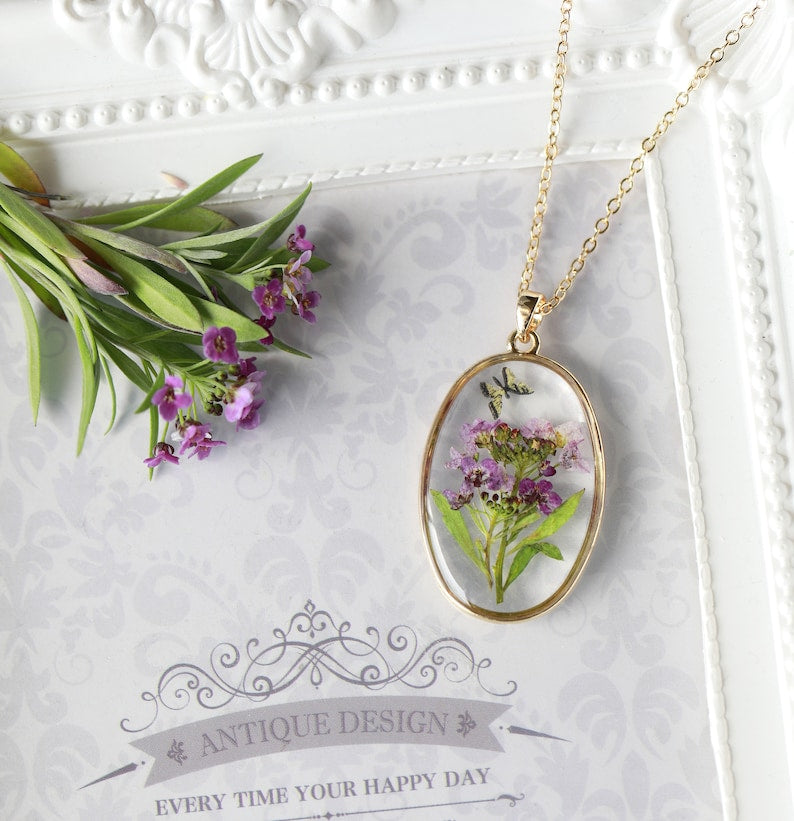 Pressed Natural Purple Flower With Butterfly Oval Shape Resin Necklace Mother's Day Gift