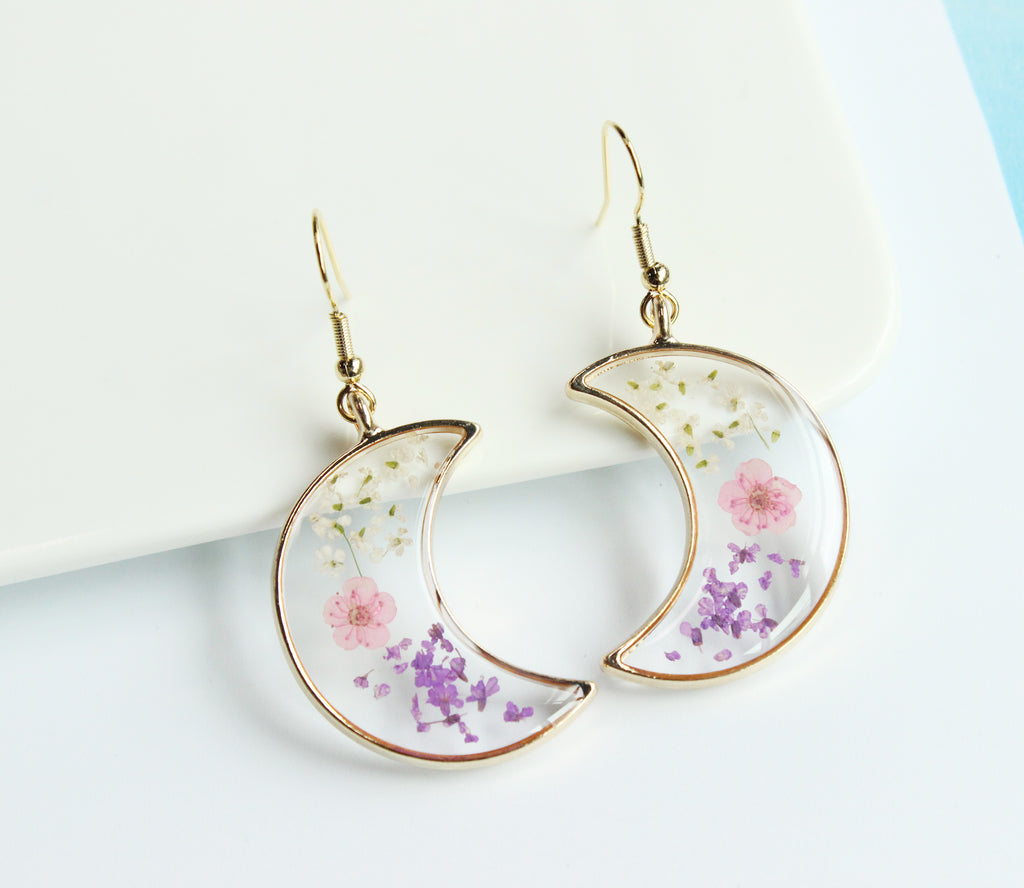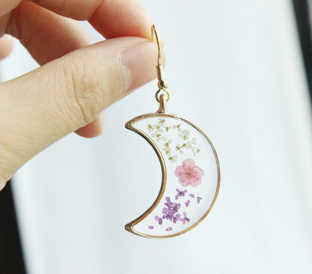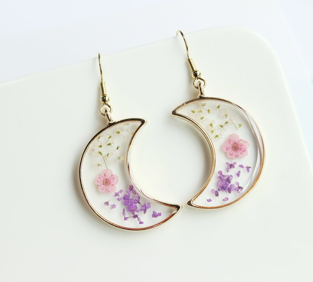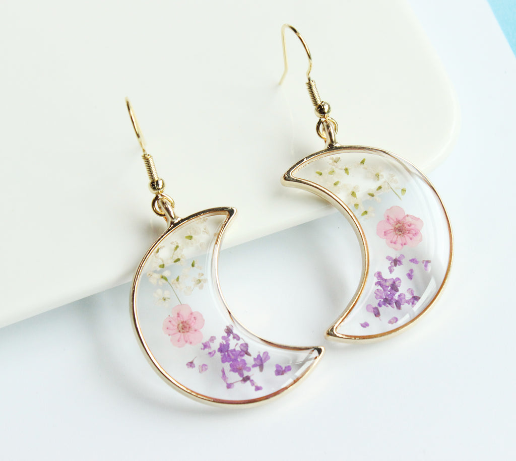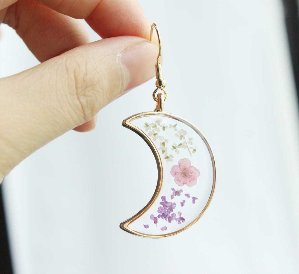 1pcs Crescent moon Pressed Flower Pendant necklace Earrings