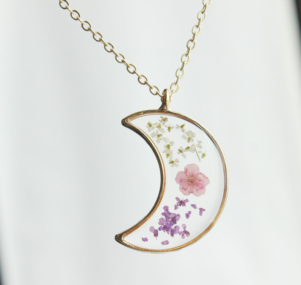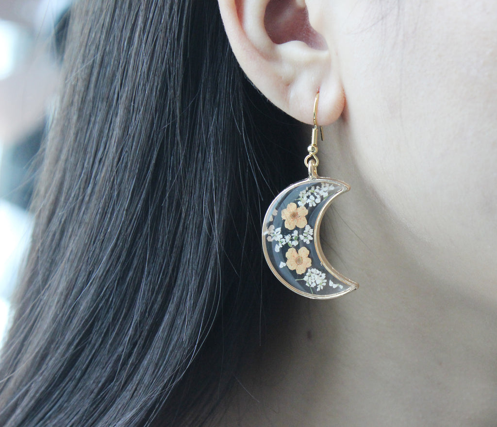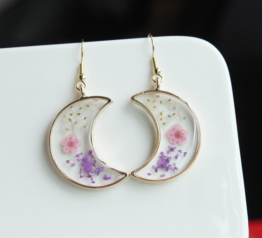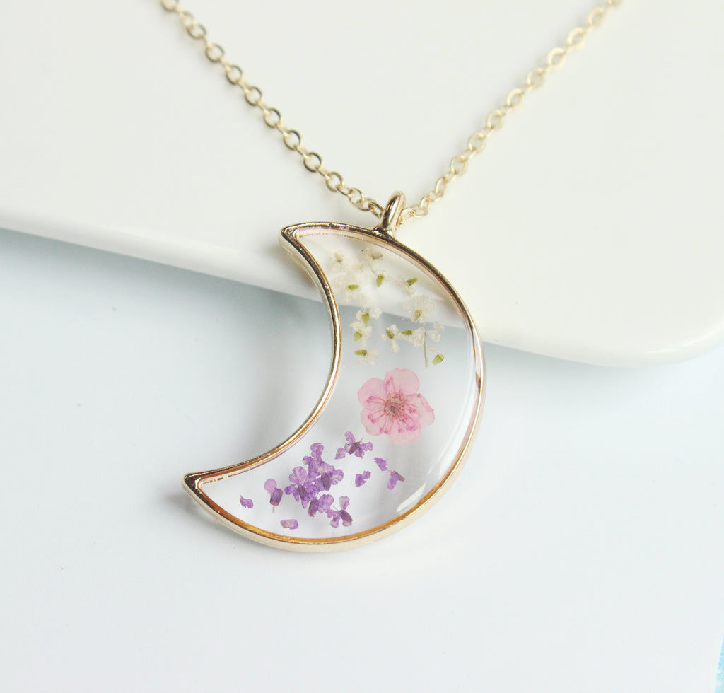 1pcs Crescent moon Pressed Flower Pendant necklace Earrings