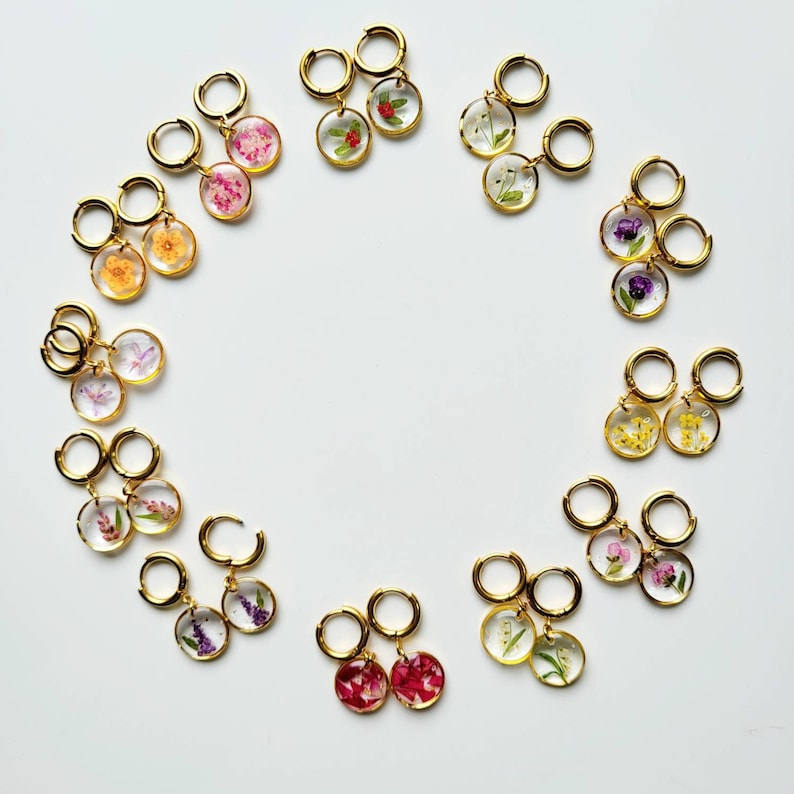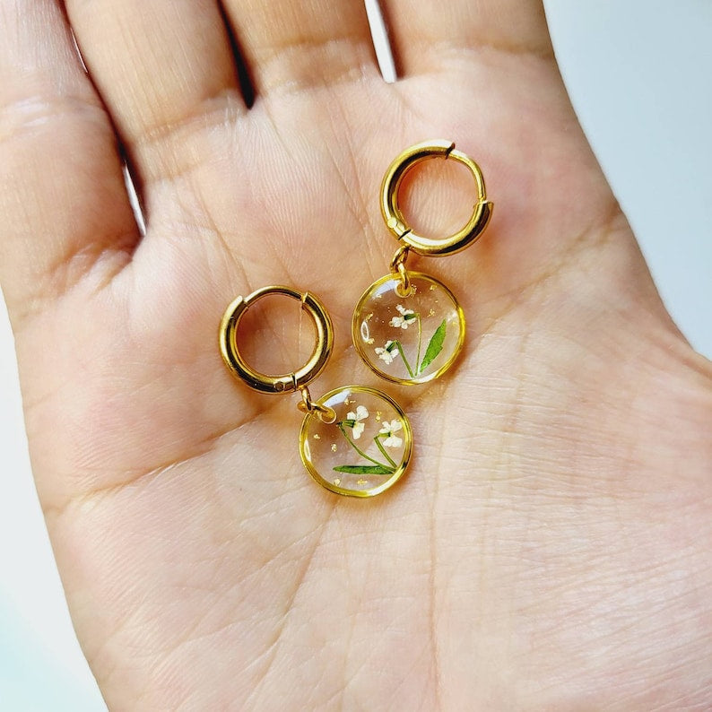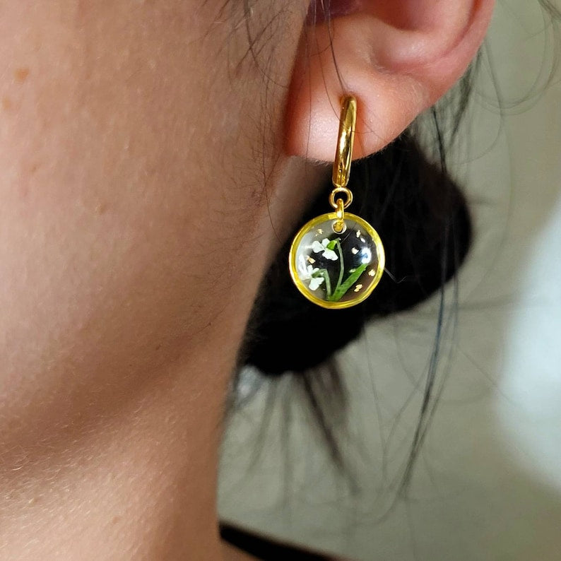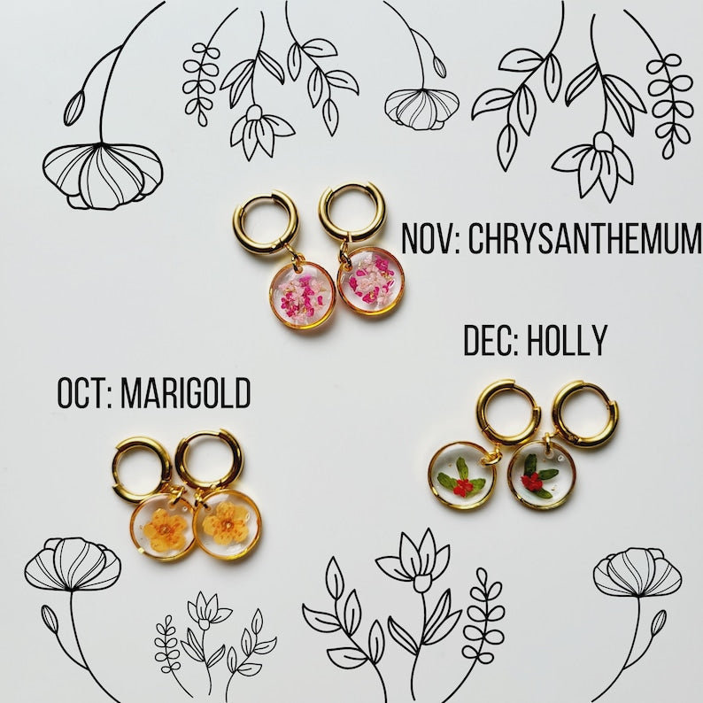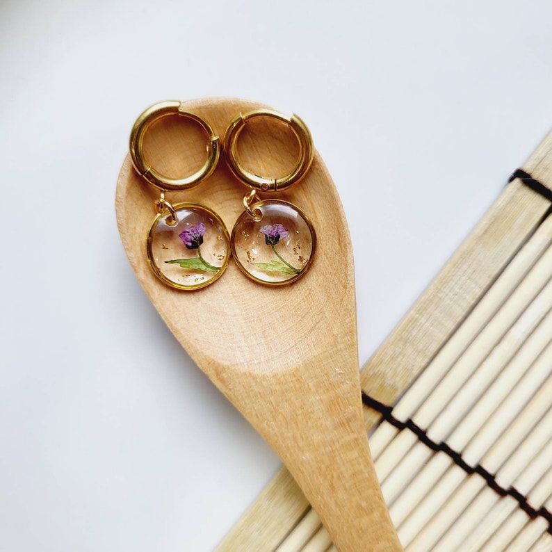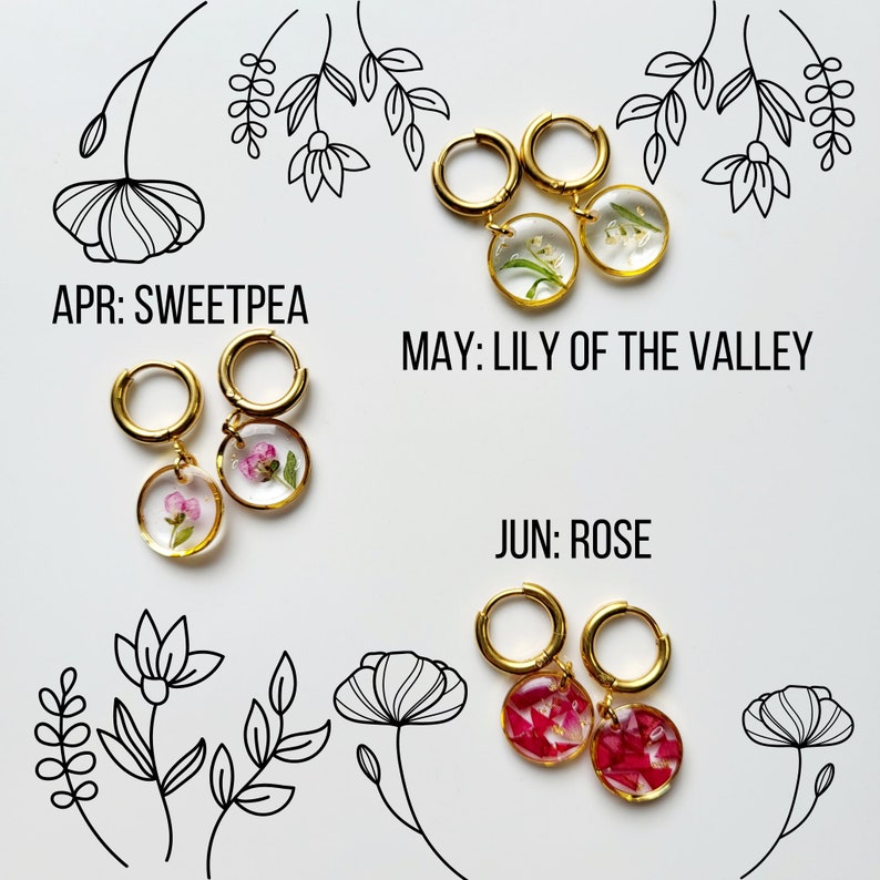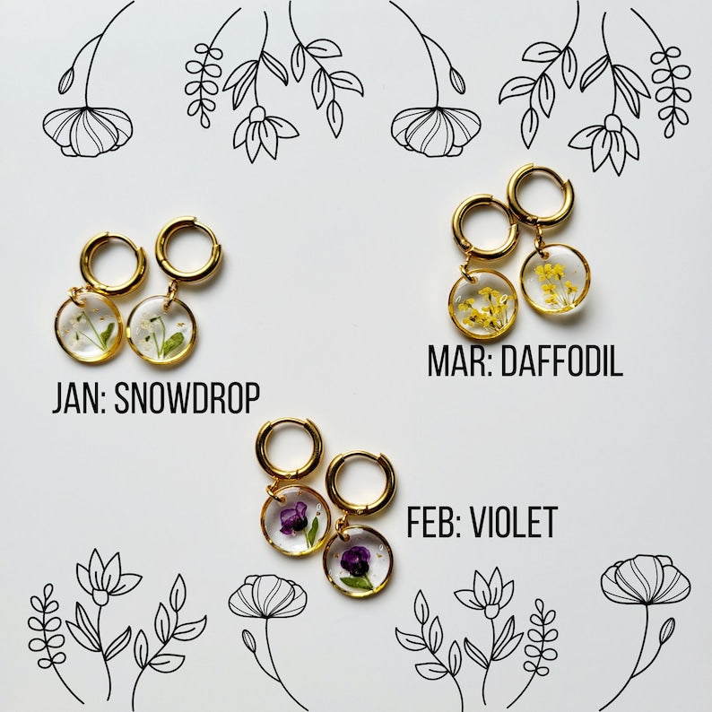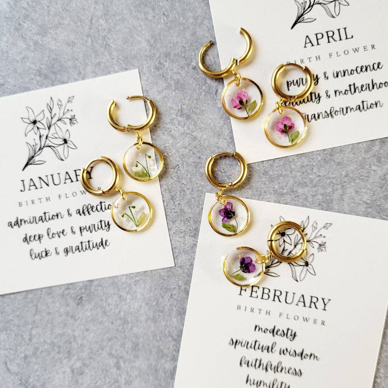 Birth flower dangle hoop earring, Handmade Birth Month Real Pressed Flower jewelry, bridesmaid proposal gift, birthday present idea for her