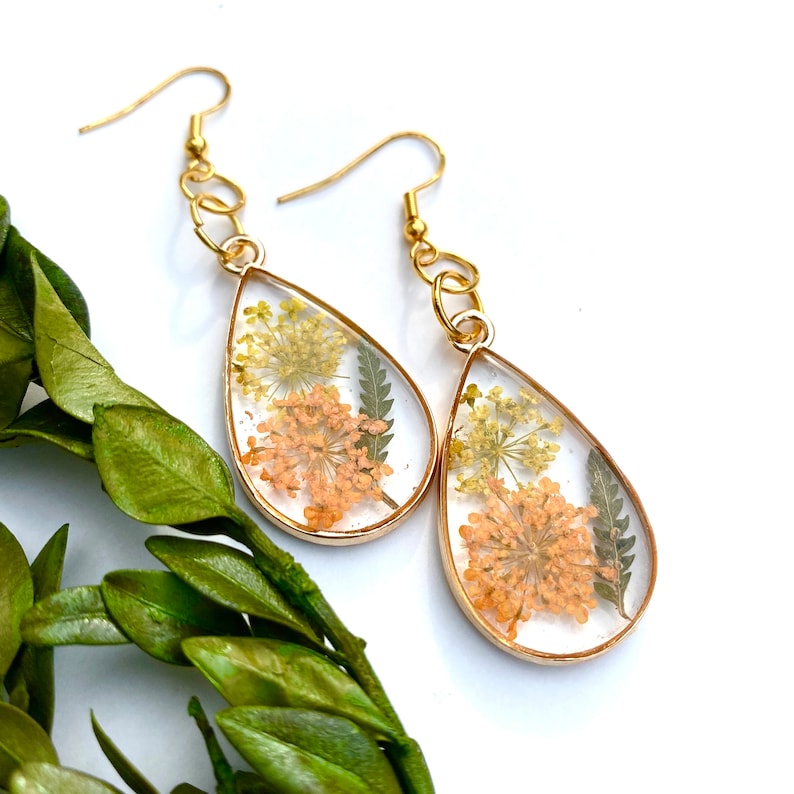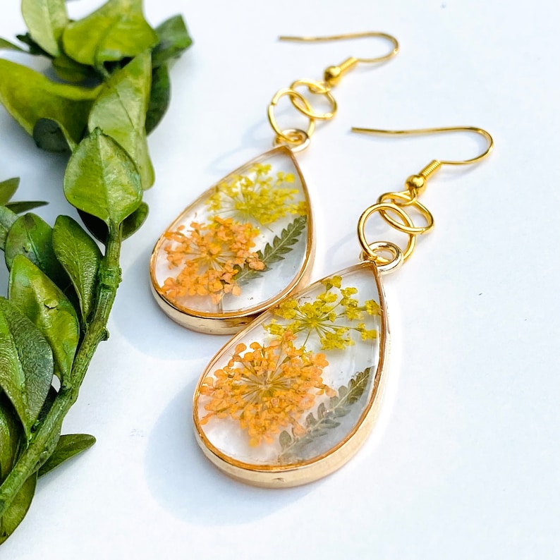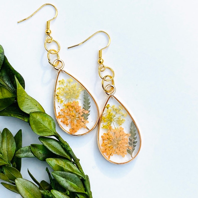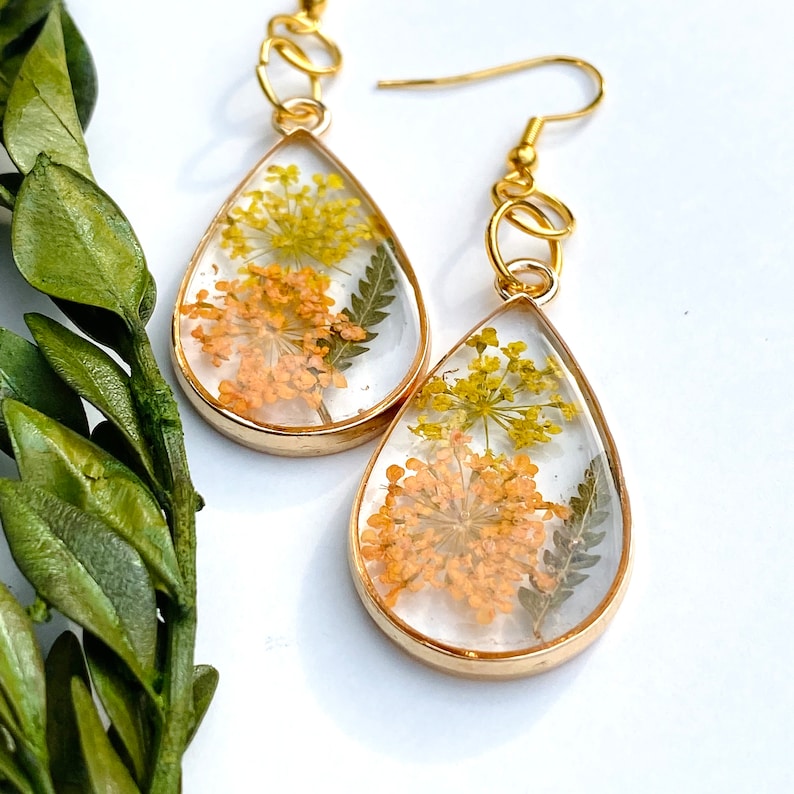 Colorful Flower Earrings, Gold Dangle Teardrop Earrings, Gold Earrings, Real Flower Jewelry, Bohemian Flower Earring, Summer Earrings