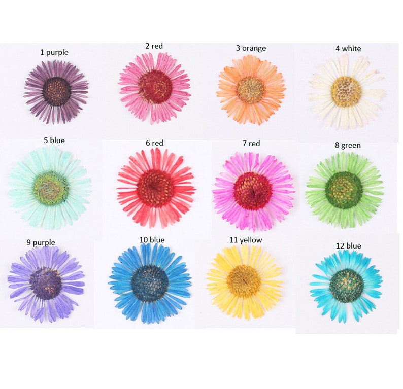 Color: 1 purple, 2 red, 3 orange, 4 white, 5 blue, 6 red, 7 red, 8 green, 9 purple, 10 blue, 11 yellow, 12 blue