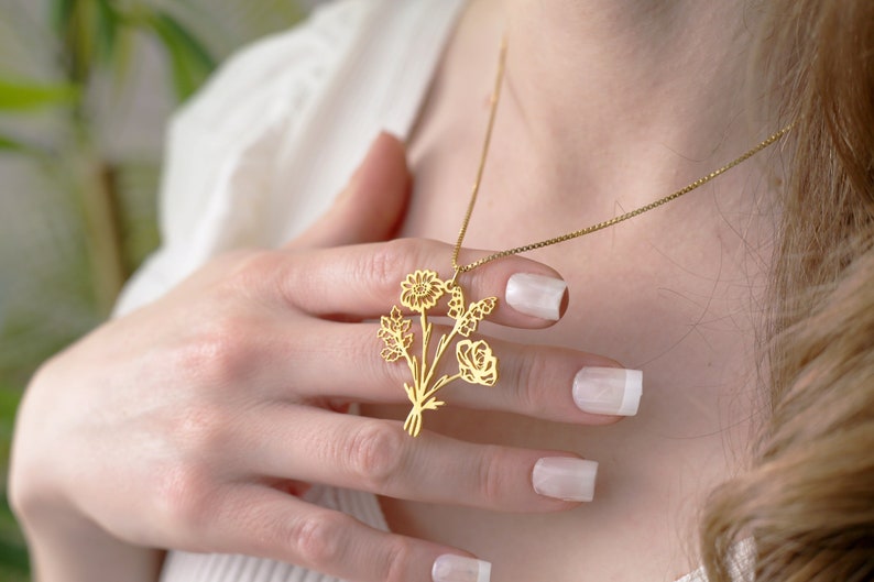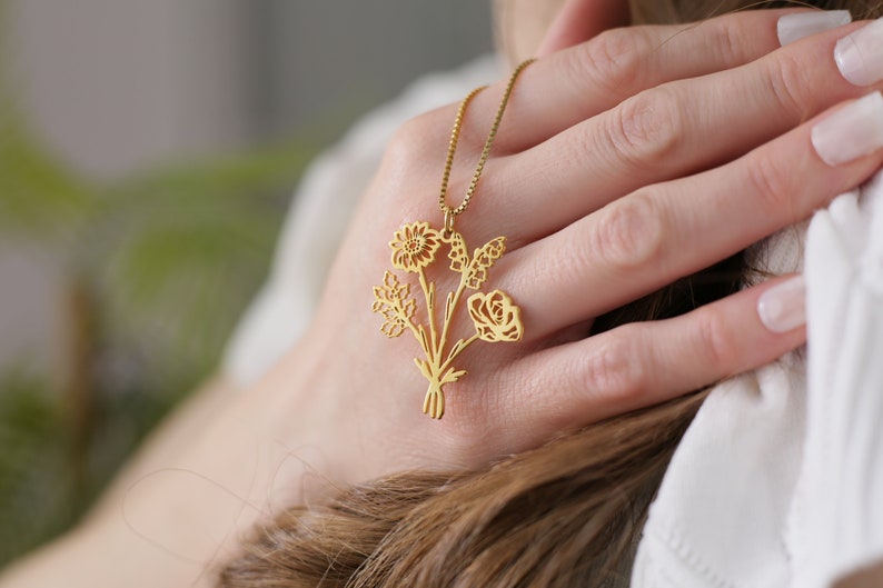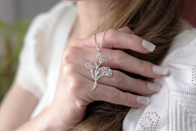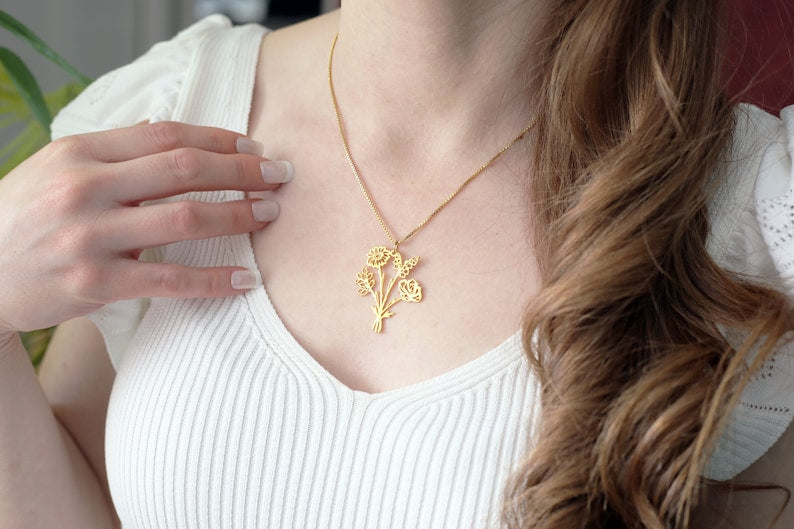 A Combined Birth Month Flower Bouquet Necklace is a beautiful and meaningful piece of jewelry that incorporates the birth month flowers of a mother's children into a single necklace. The necklace features a unique and personalized arrangement of flowers that represent the birth months of all the mother's children.