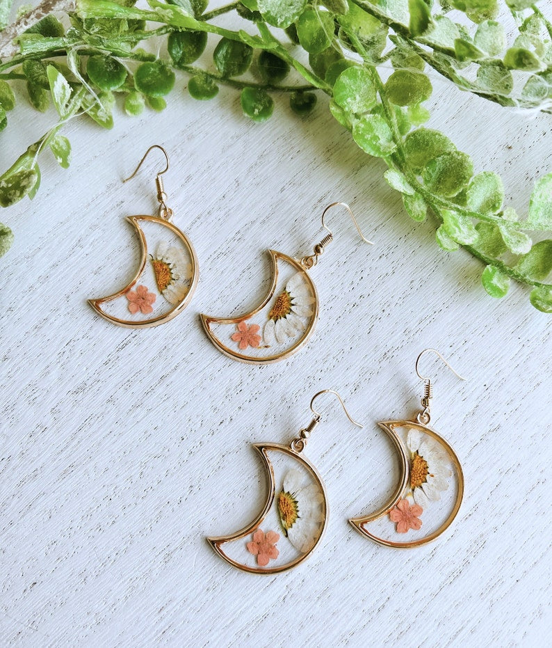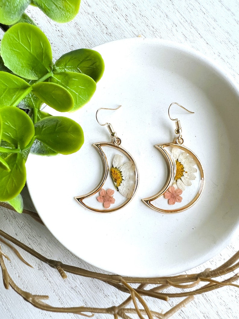 Moon Pressed Daisy Flower Earrings | Multi Flower Celestial Earrings | Resin Moon Jewelry | Resin Dried Wild Flower Drop Earrings