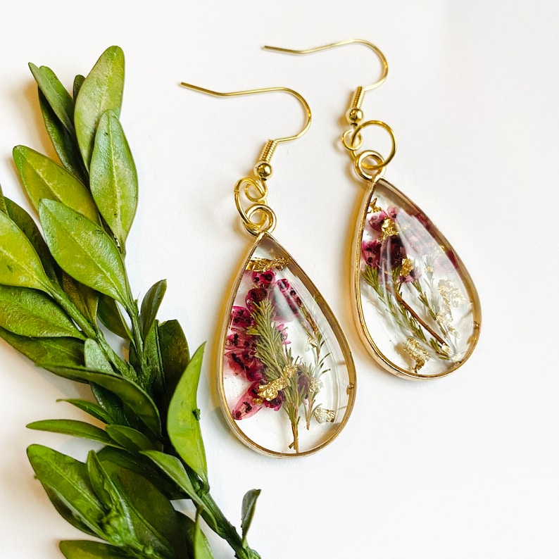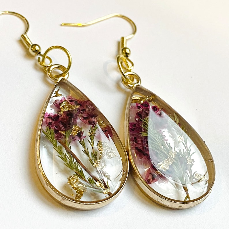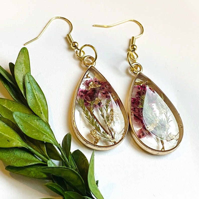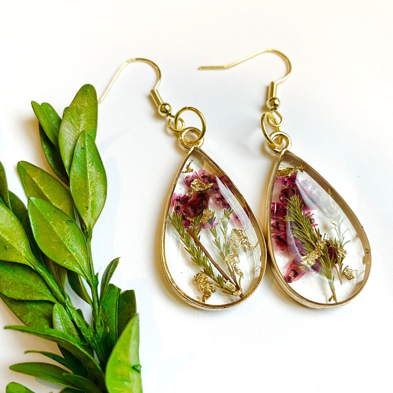 Pink Flower Earrings, Gold Plated Teardrop Earrings, Pressed Flower Earrings, Keepsake Jewelry, Pressed Flower Earring, Fall Earrings